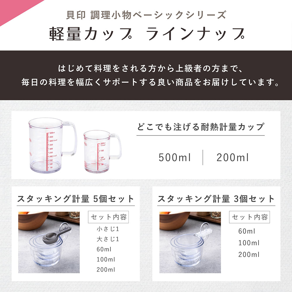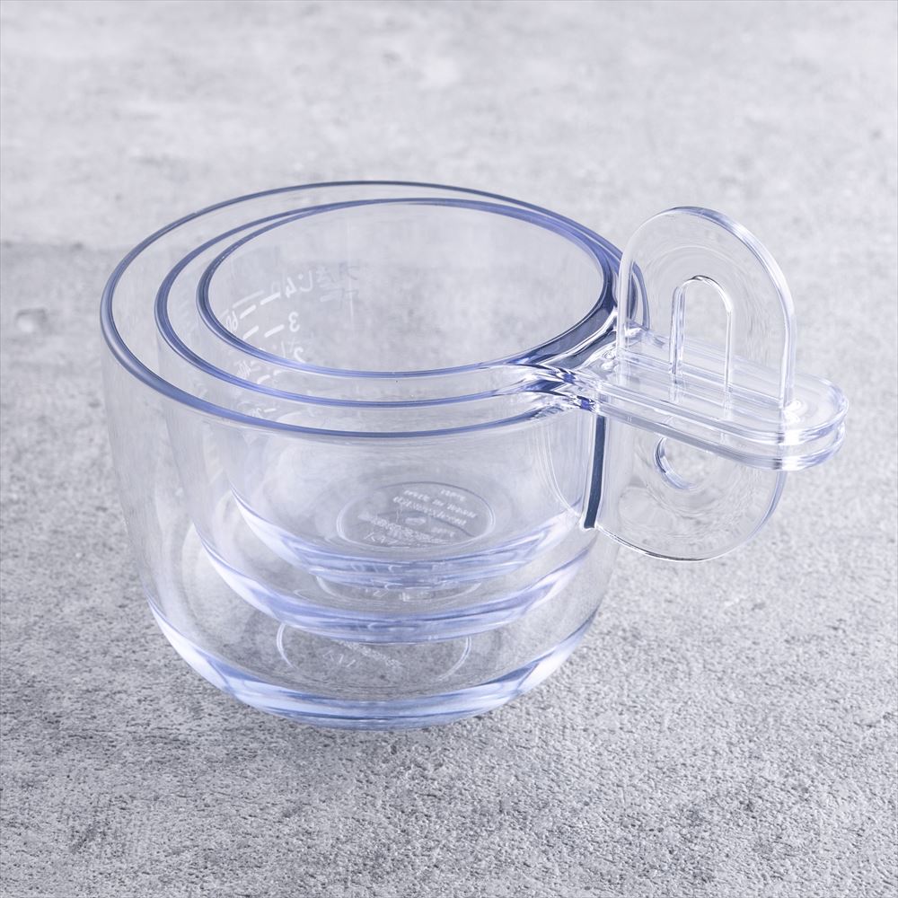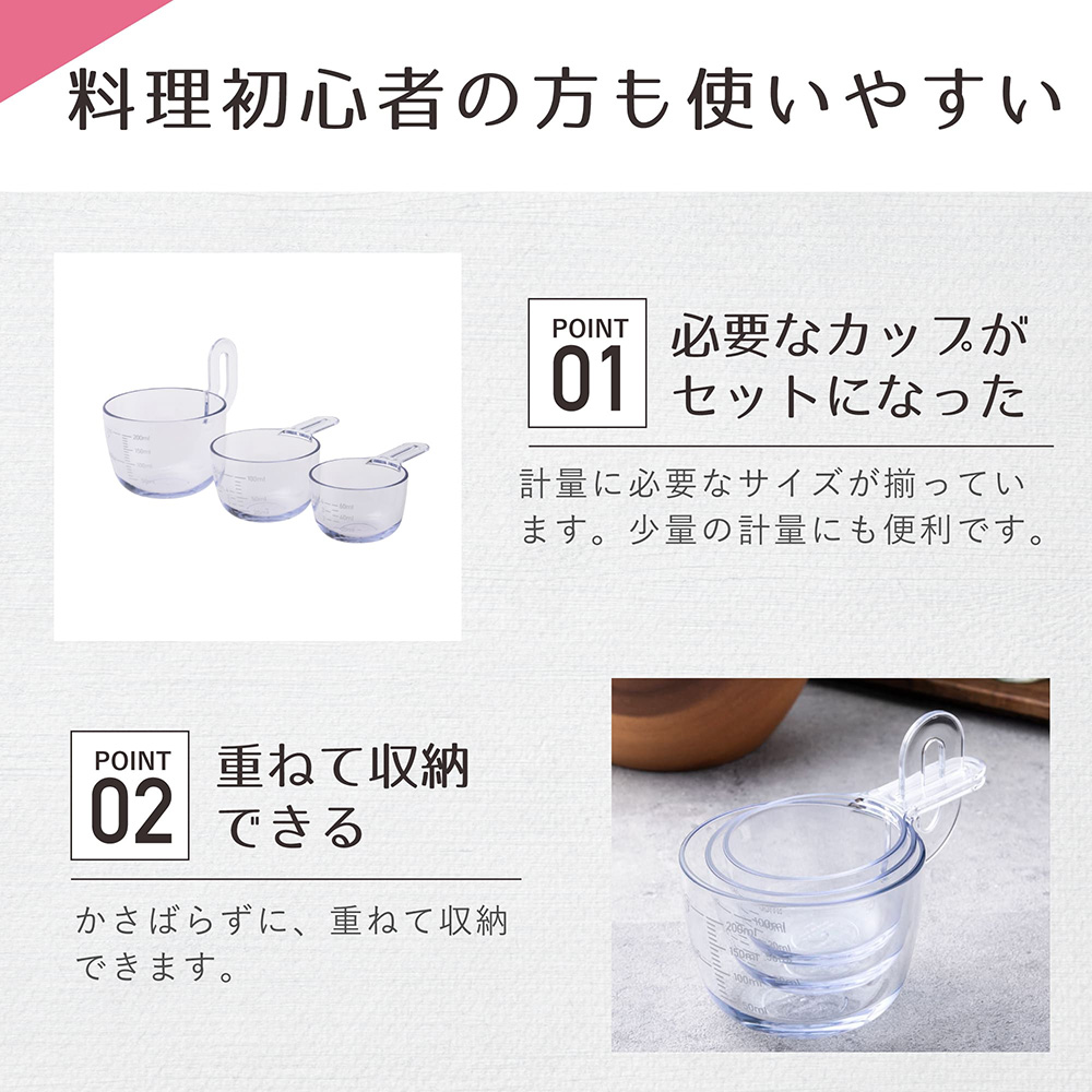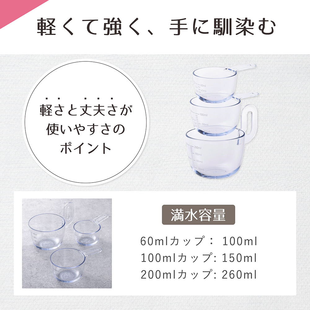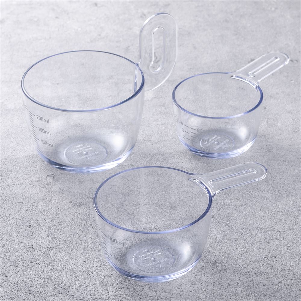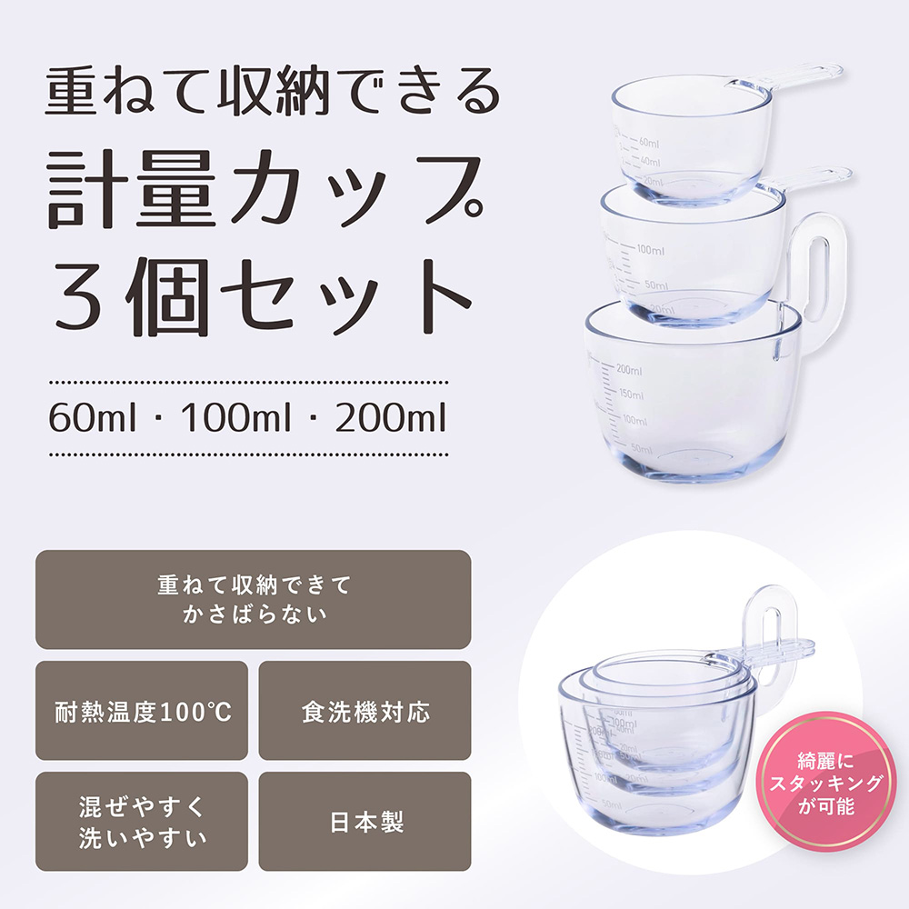 スタッキングできる60ml、100ml、200mlの計量カップのセットです。(日本製)