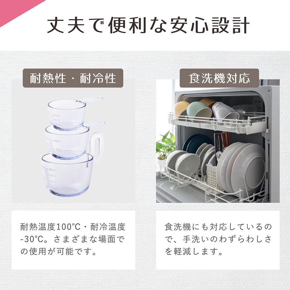 60ml、100mlカップには大さじ目盛りがあるので、少量の計量や量り置きにも便利で、丸みのあるデザインなので合わせ調味料などが混ぜやすく、洗いやすい形状です。