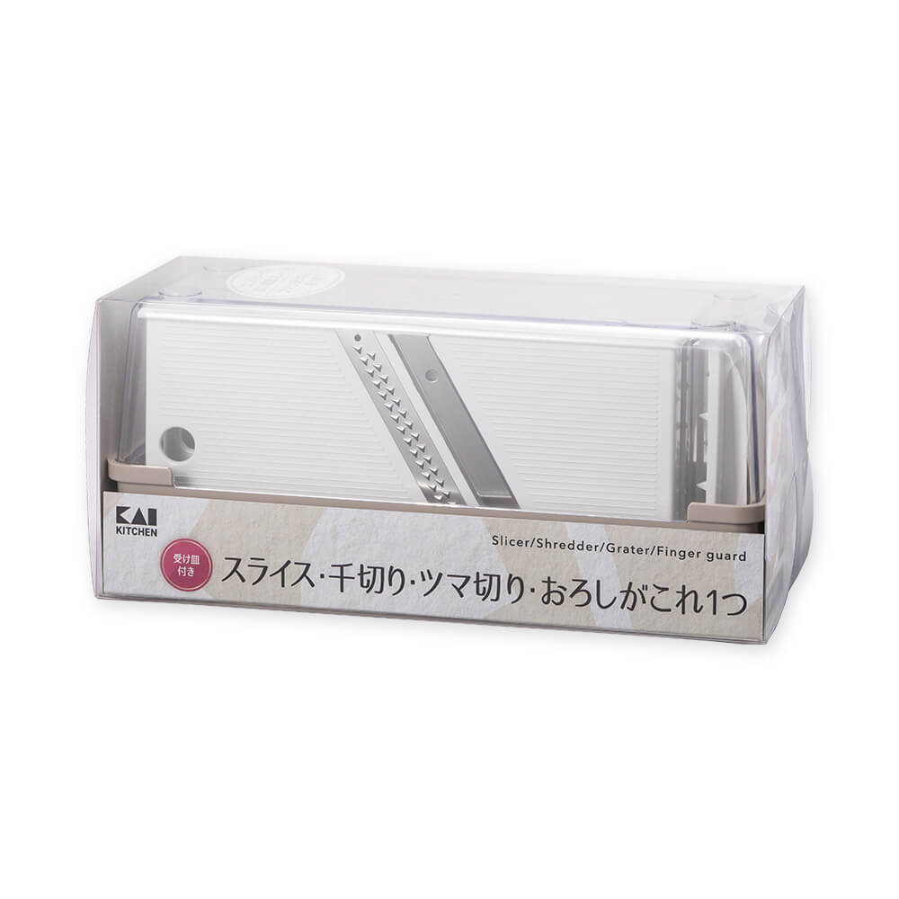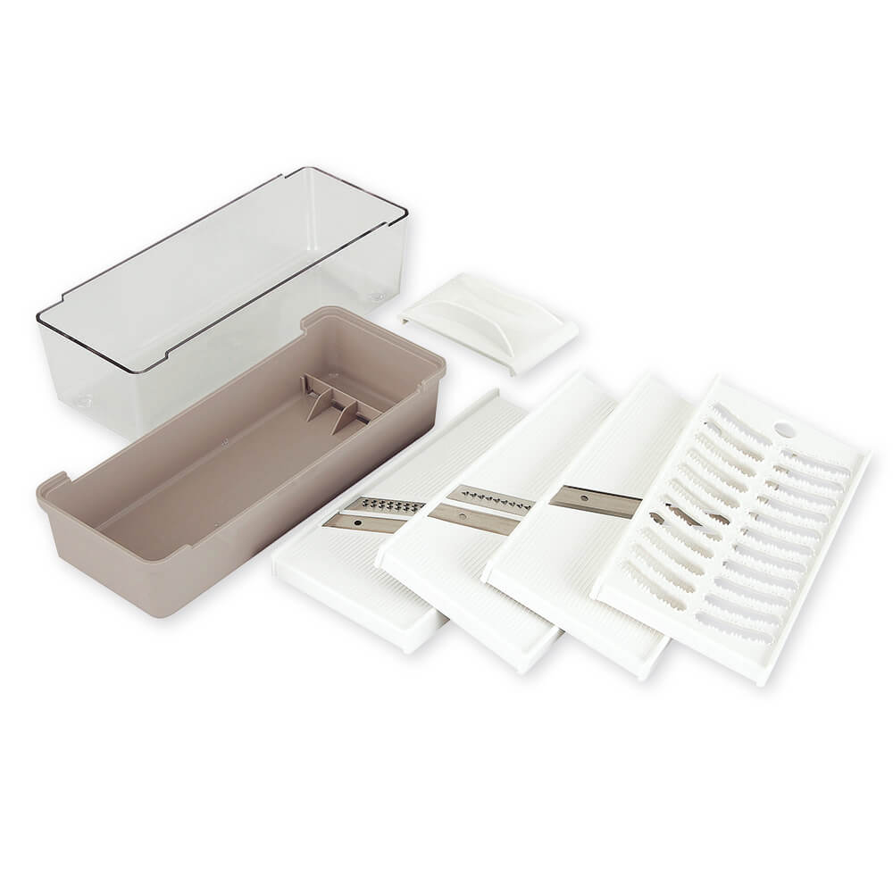 1台で「スライス・千切り・ツマ切り・おろし」ができる調理器セットです。安全に無駄なく調理できる指ガード付き。