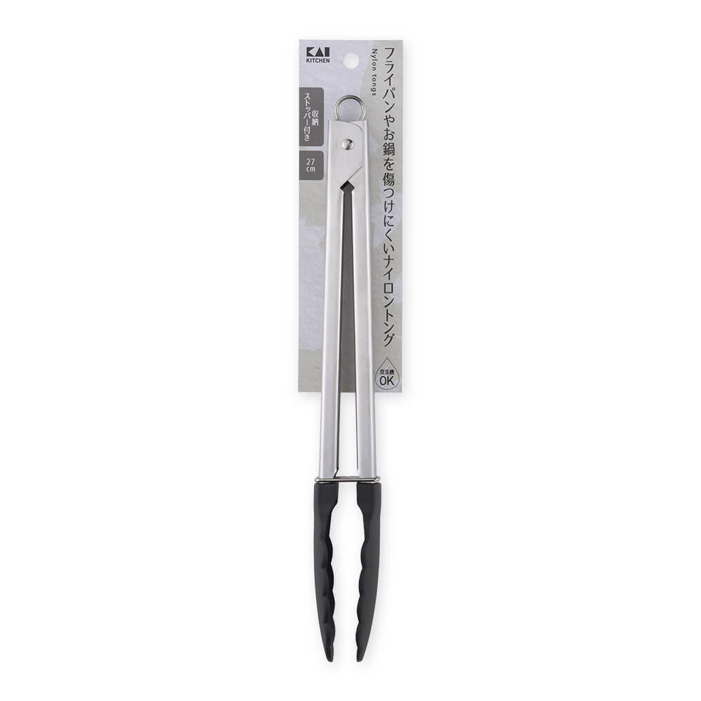 広がらずに収納できる、ストッパー付のナイロン製トング[27cm]です。盛り付けやフライパン調理に便利。