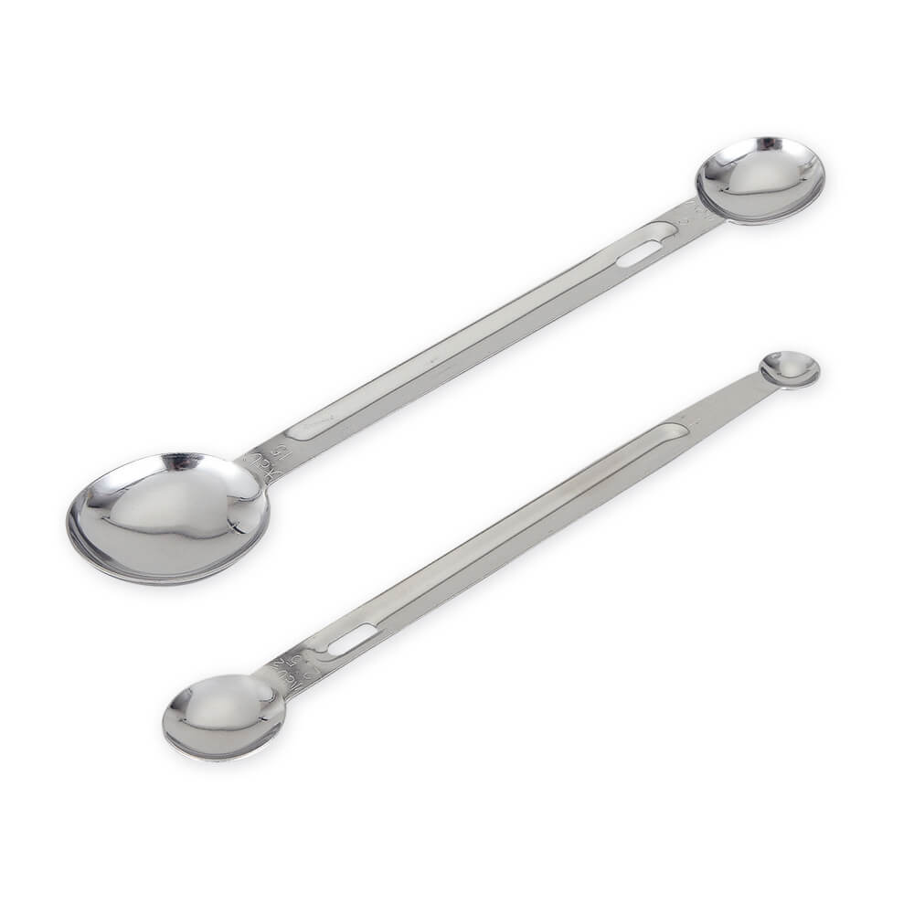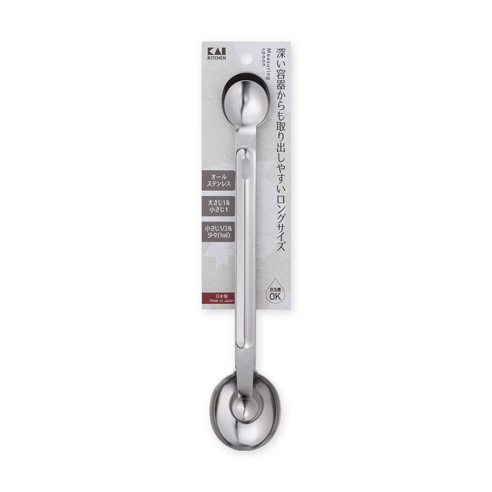 大さじ1(15ml)・小さじ1(5ml)・小さじ1/2(2.5ml)少々(1ml)の4種類がセットになった、ステンレス製の計量スプーンです。(日本製)