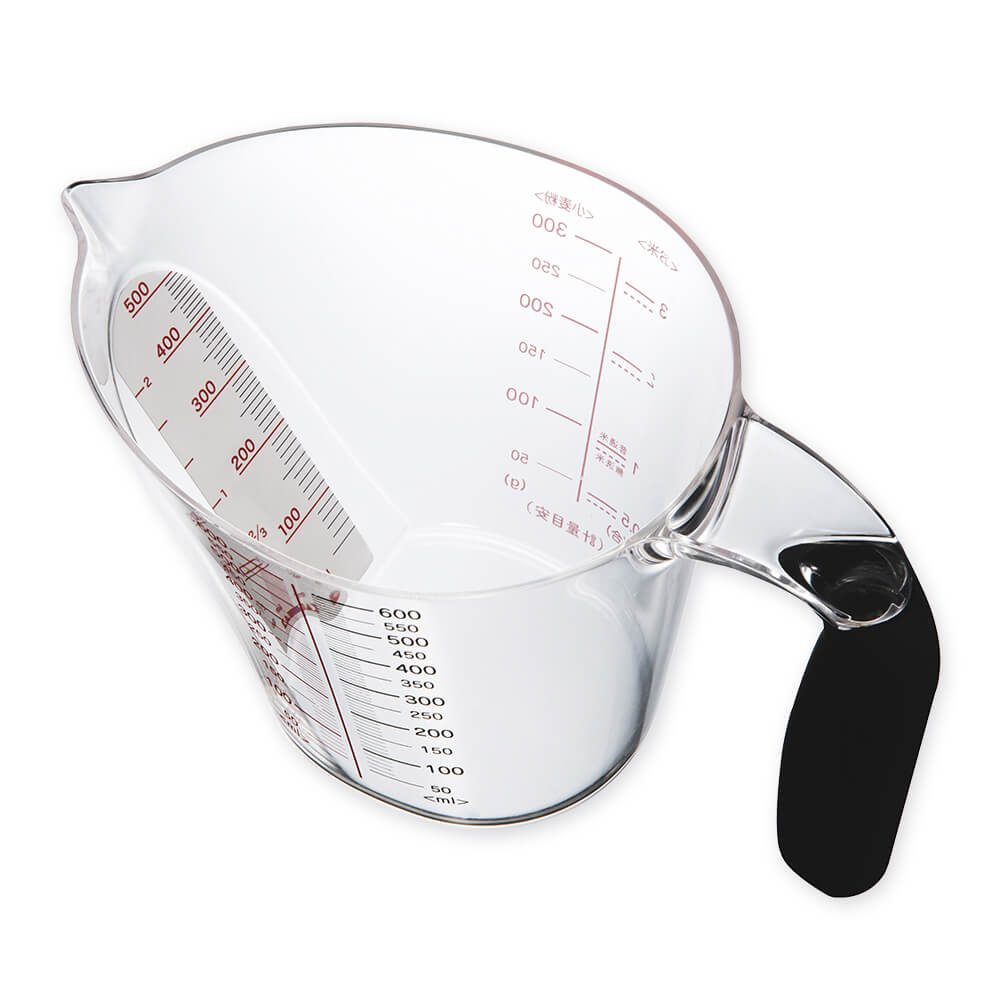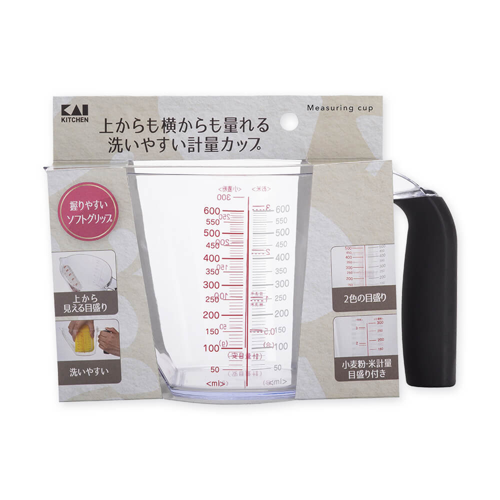 上からも横からも見て量れる、握りやすいソフトグリップ付きの計量カップです。(日本製)