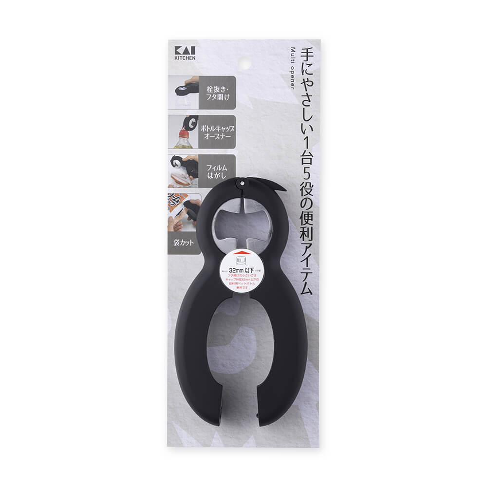 栓抜きはもちろん、フタ開け、プルトップオープナー、ハムなどのフィルムはがし、袋カットなど1台5役の万能オープナーです。