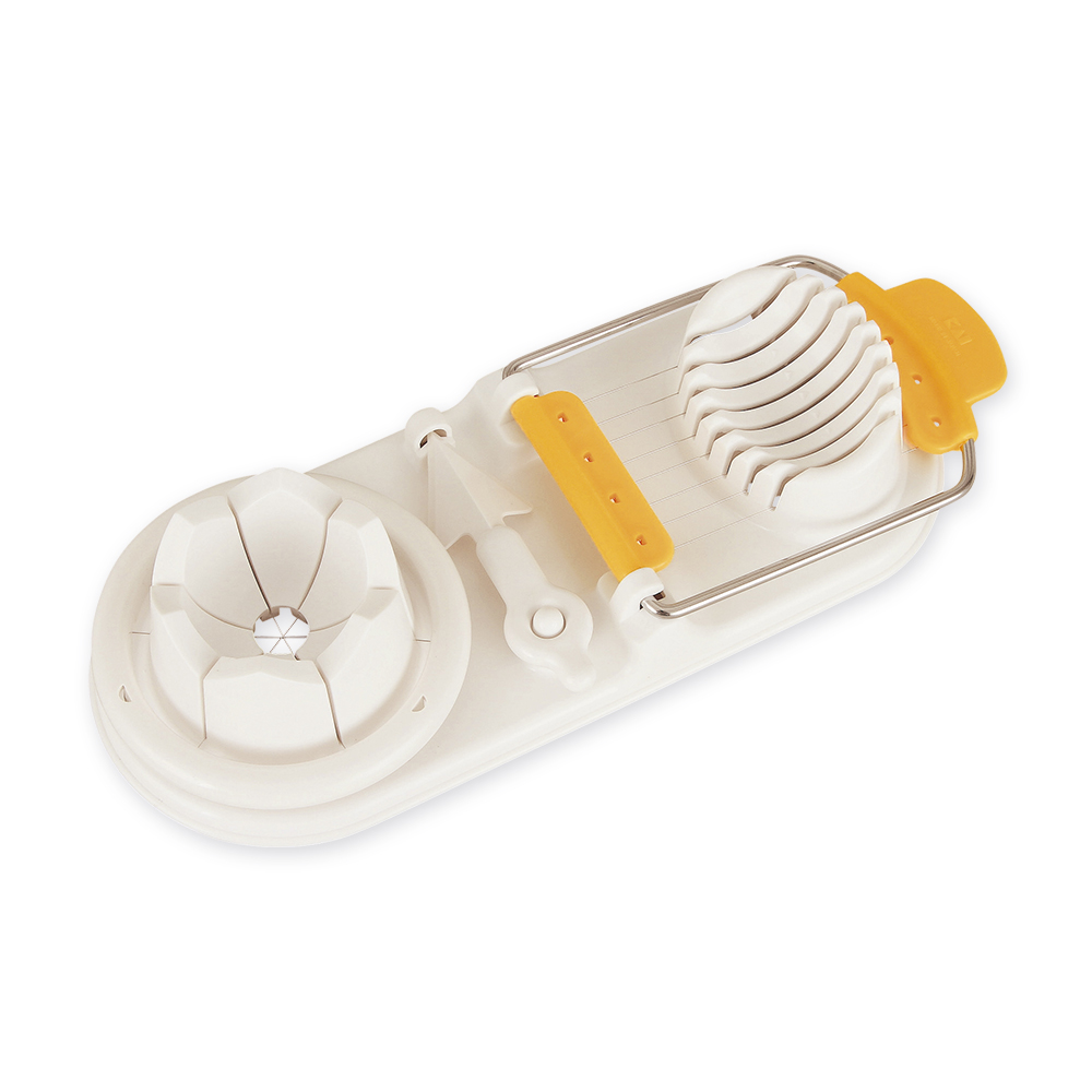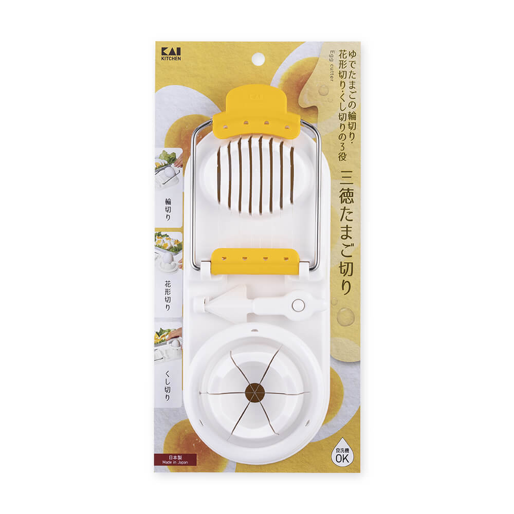 ゆでたまごの輪切り、花形切り、6等分のくし型切りがきれいにできる、1台3役のたまご切りです。(日本製)