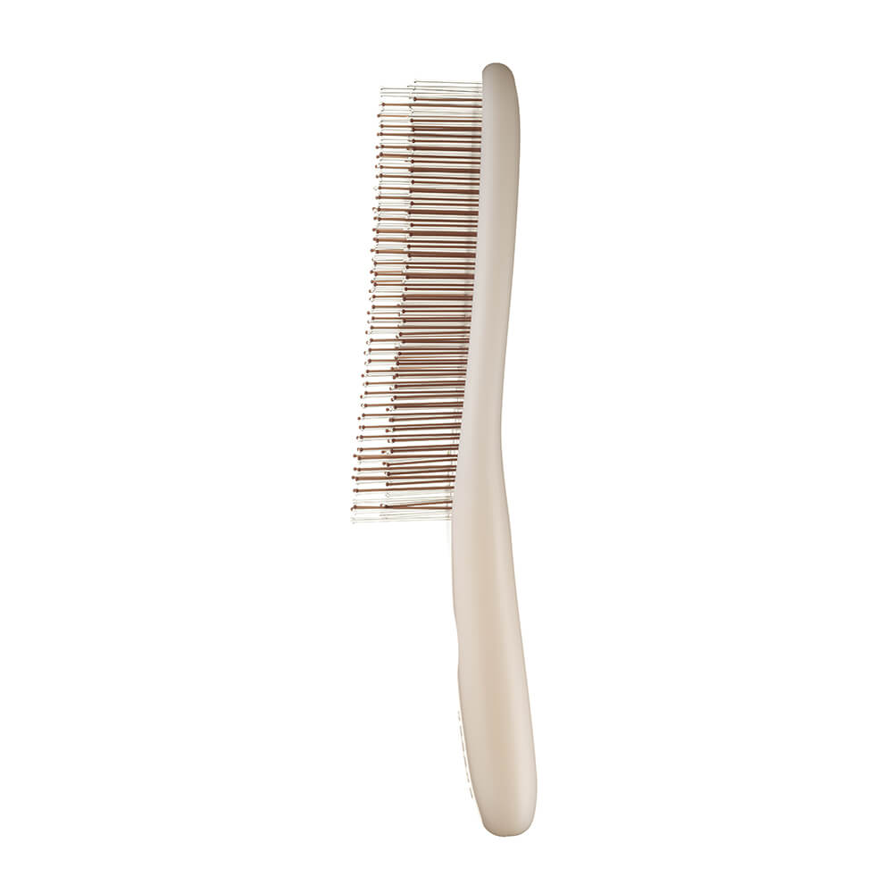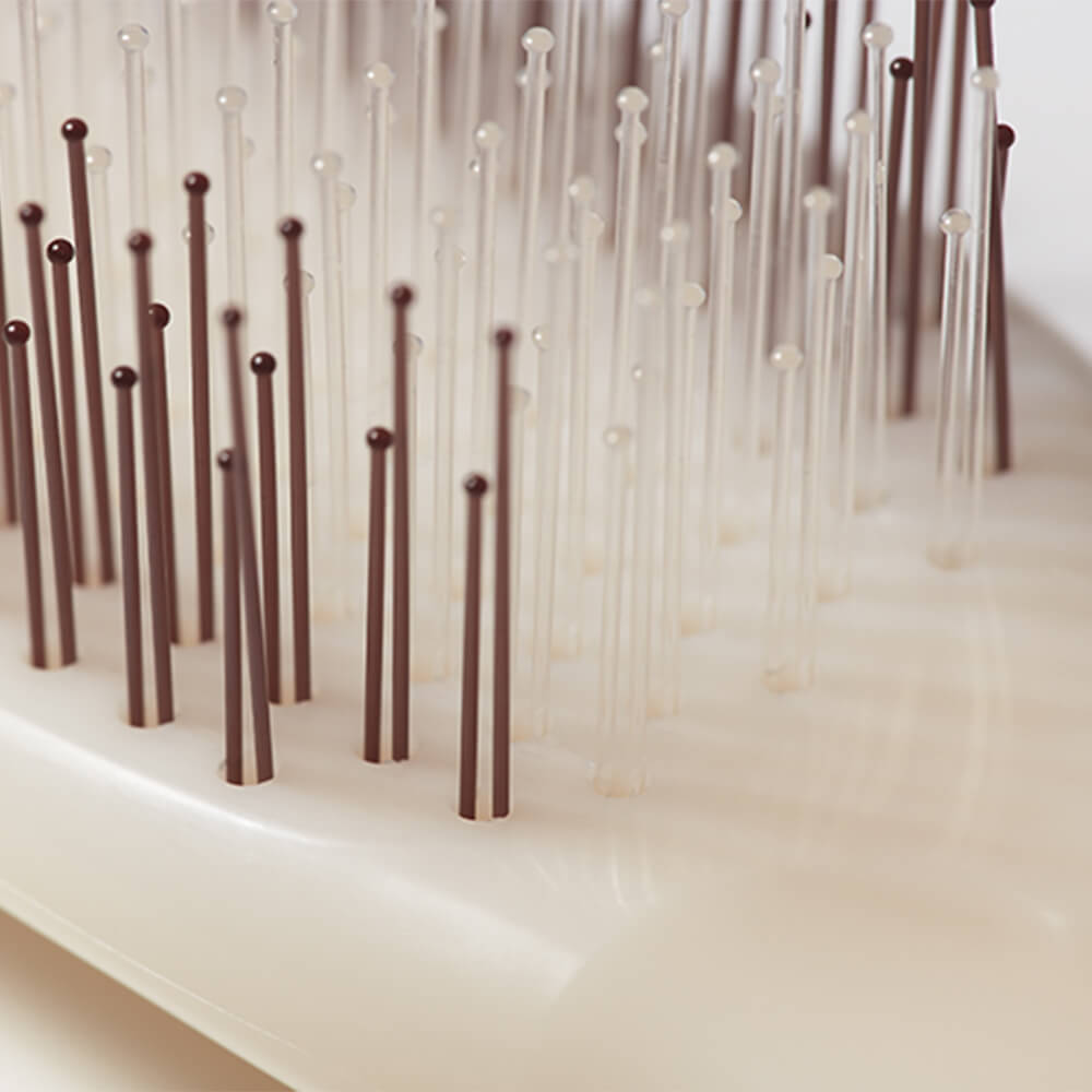 やさしい肌あたりを考えて、やわらかめのピンとかためのピンを配列。プロテクションピン™を採用して、ピンとピンの間隔があることで髪の摩擦が少なく、櫛通りがなめらかです。ピンの先は球状で頭皮を傷つけにくく、心地よく頭皮に刺激を与えます。