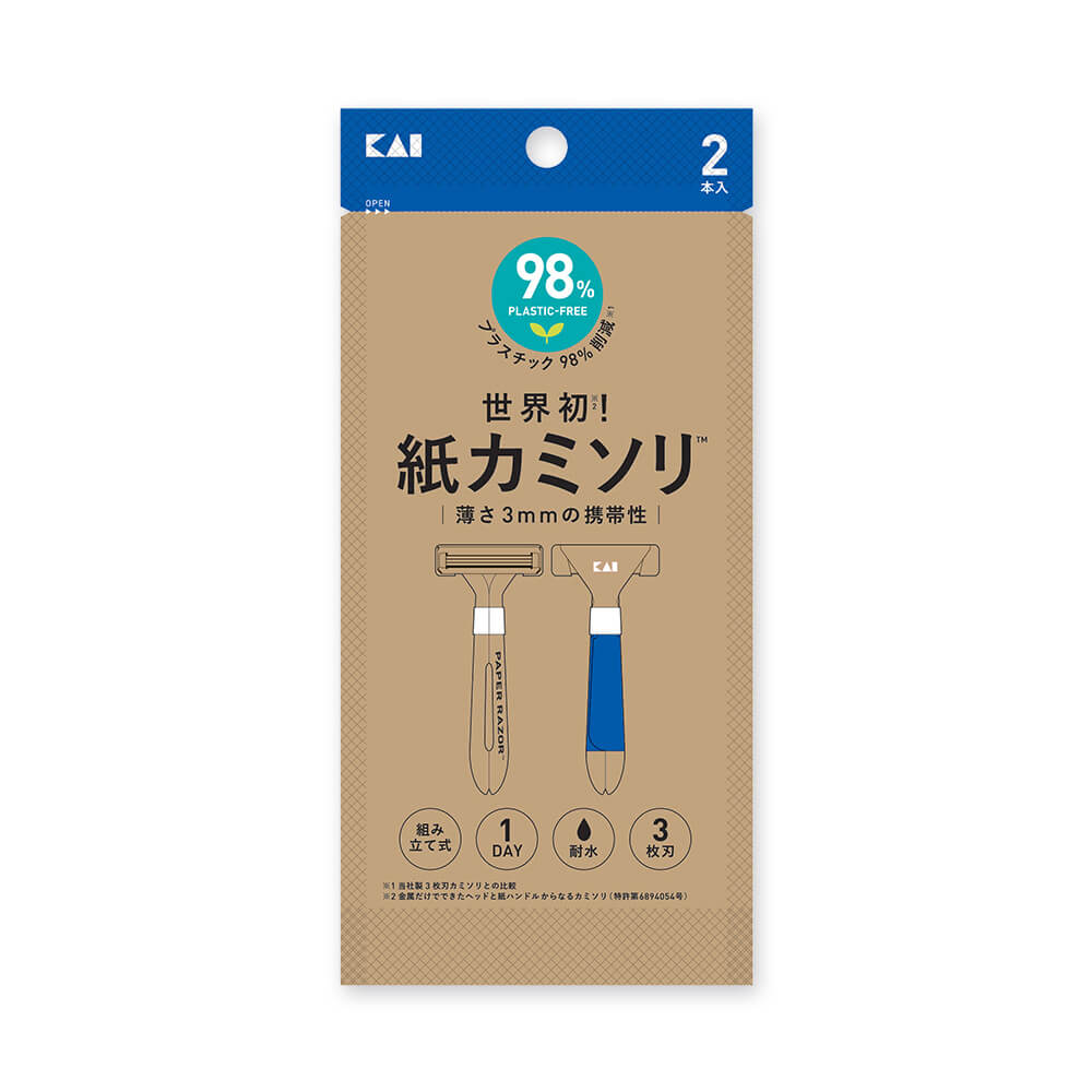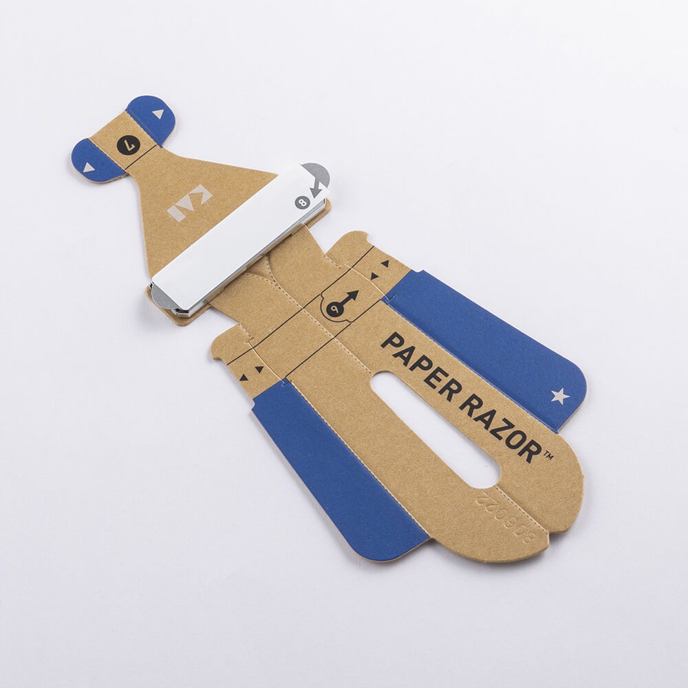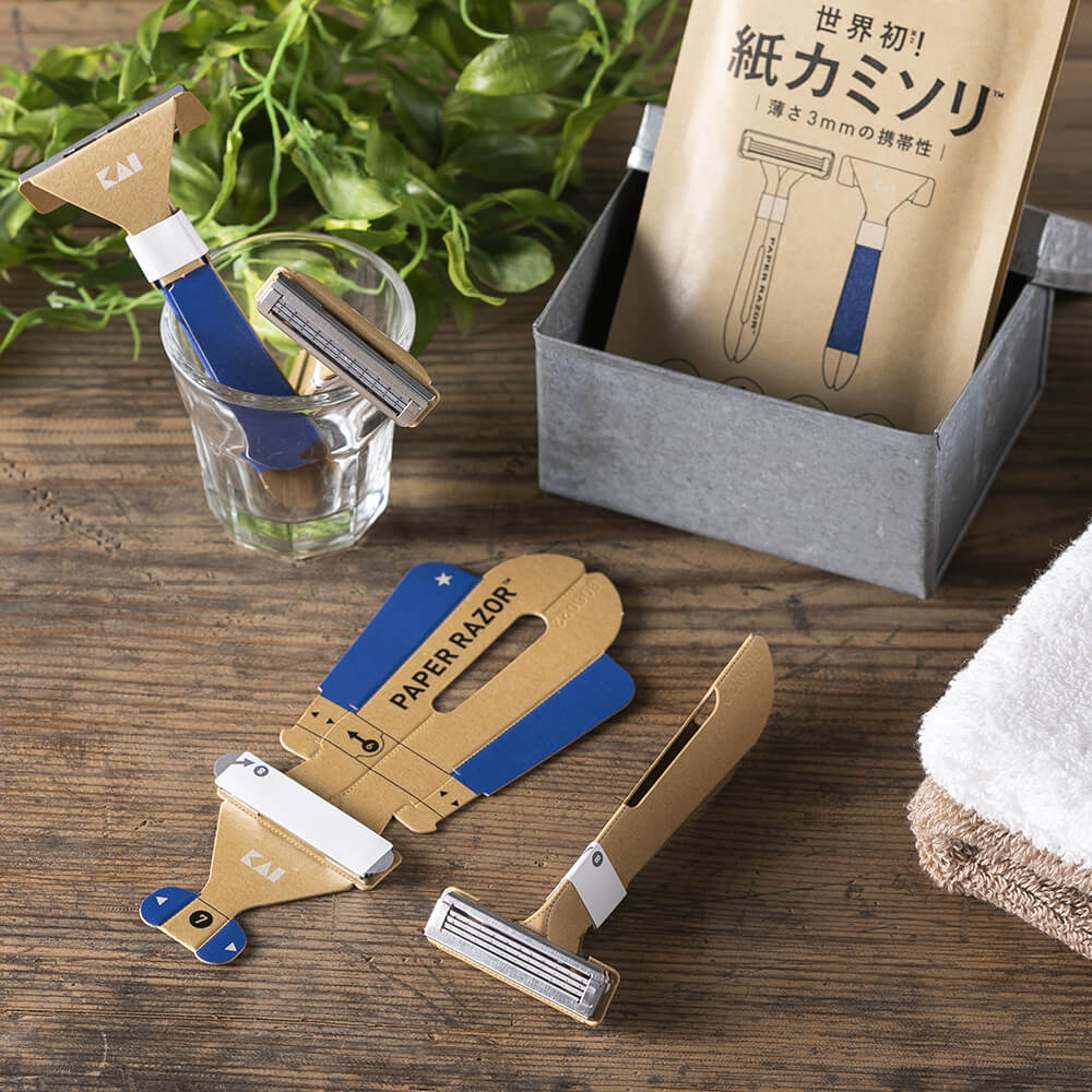 ハンドルに紙、刃体(ヘッド部含む)に金属を使用し、“脱プラスチック”※を実現した、折り紙のように一枚の紙を組み立てて使う紙カミソリ。