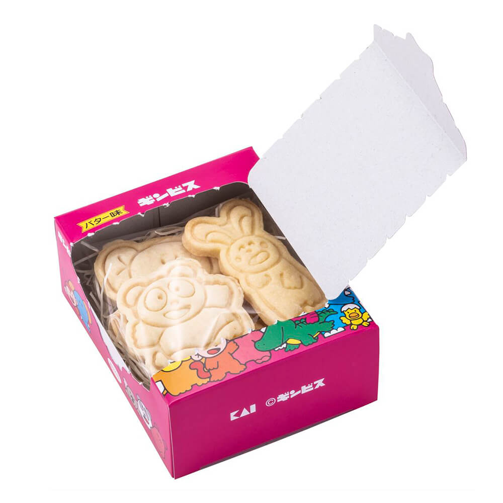 たべっ子どうぶつビスケットのパッケージのようなデザインのラッピングボックスです。(日本製)箱とOPP袋が3セット入っており、クッキーが約3枚くらい入るサイズ感です。かわいいデザインでプチギフトにぴったり!©ギンビス
