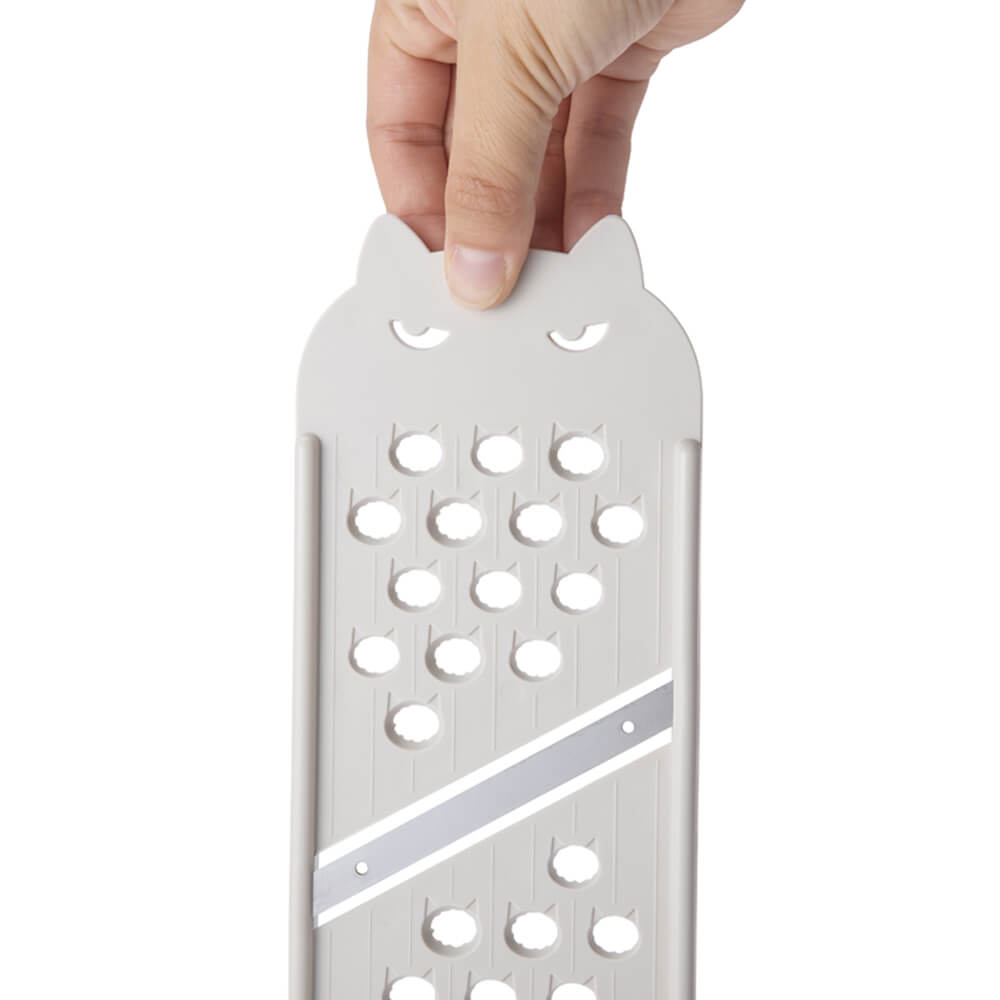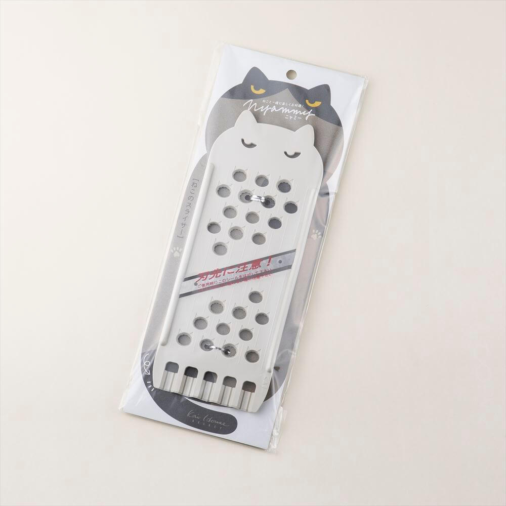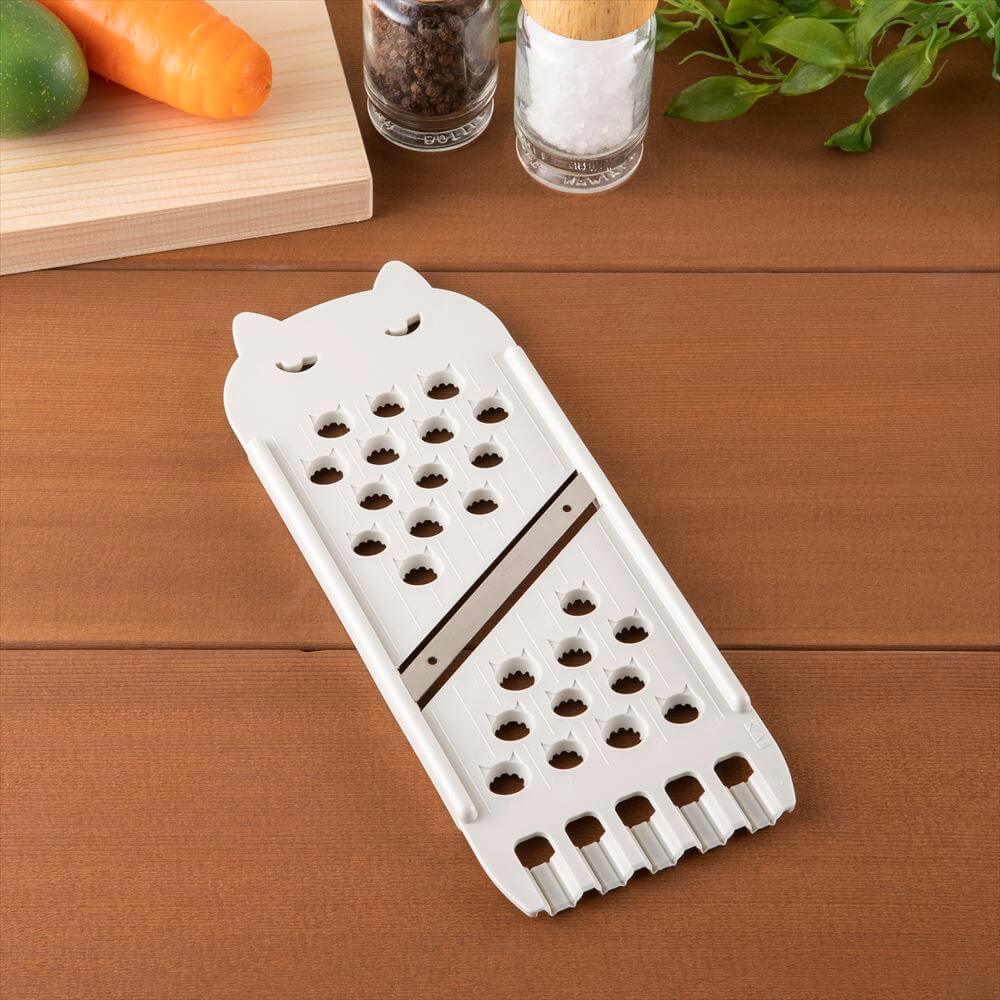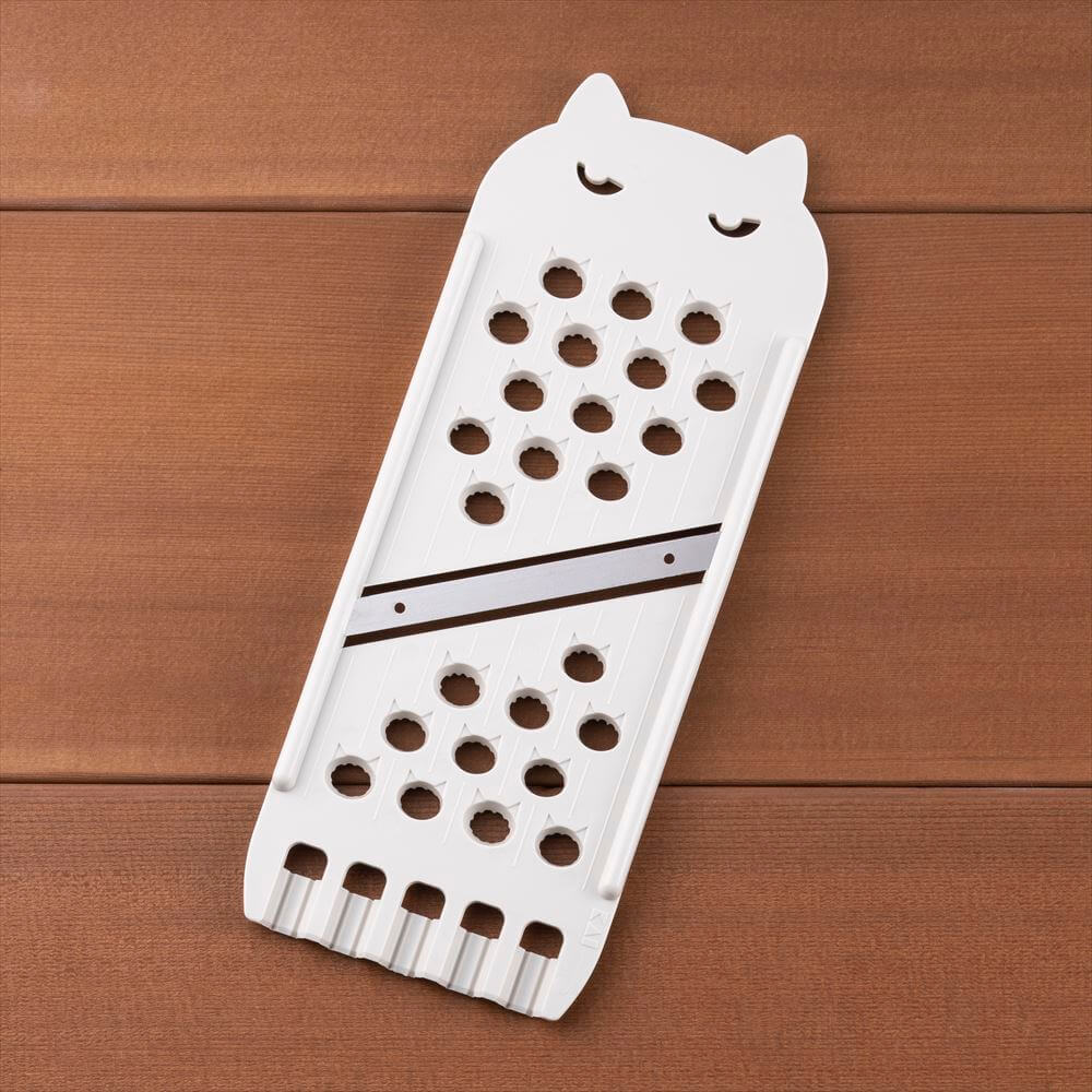 - \新色 ウォームグレーカラー登場/“ねこと一緒に楽しくお料理!”当社売れ筋商品の性能を活かしつつ、キッチンの雰囲気を邪魔しない形でネコモチーフを取り入れました。ネコ好きの方もそうでない方も『欲しい!使いたい!』と思える、ほどよいネコ感を大切にしています。スライス・おろし・飾り切りがこれひとつでできちゃう!スピーディに切れる両刃のスライサーです。本体上部だけでなく飾り切り部分にもネコモチーフが取り入れられており、薄切りのハムやチーズをネコ型のリボン状にすることができます。