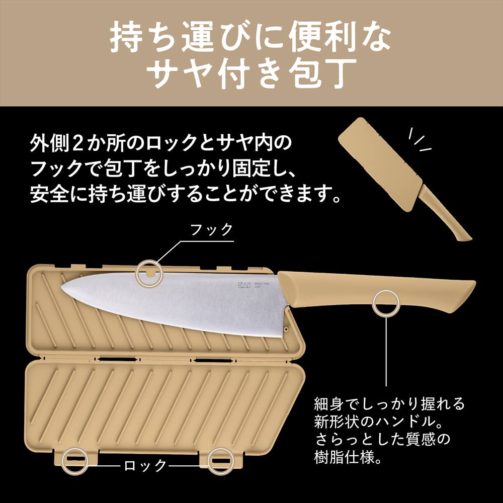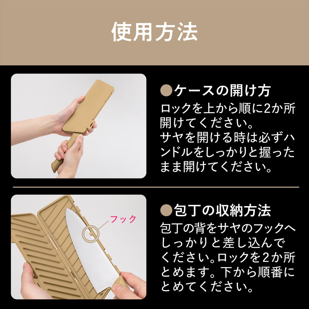 外側2か所のロックとサヤ内のフックで包丁をしっかりと固定し、安全に持ち運びすることができます。