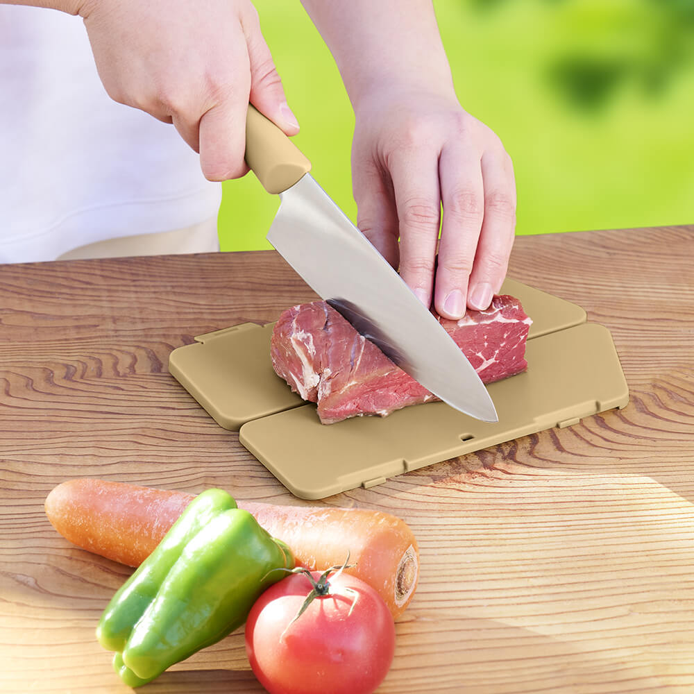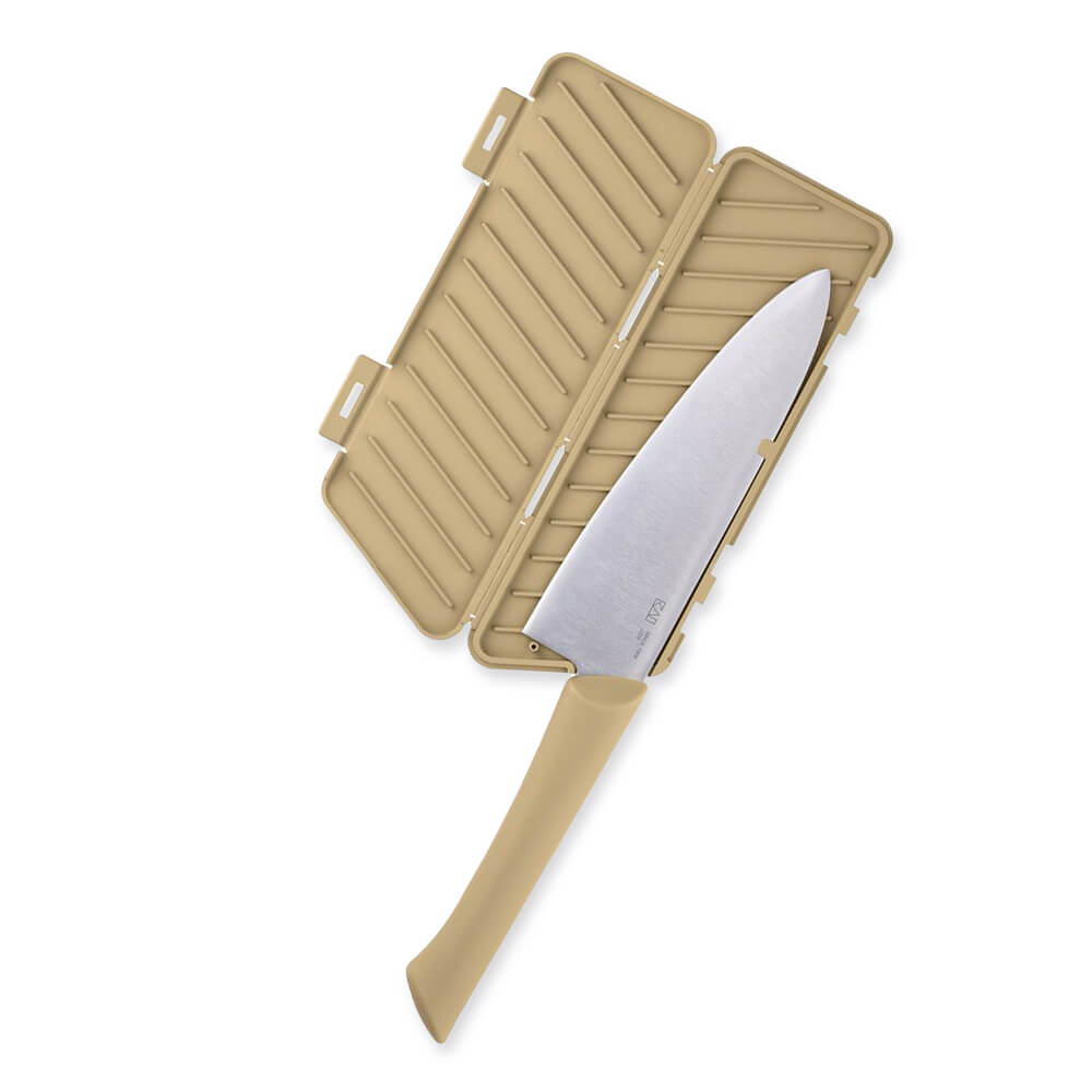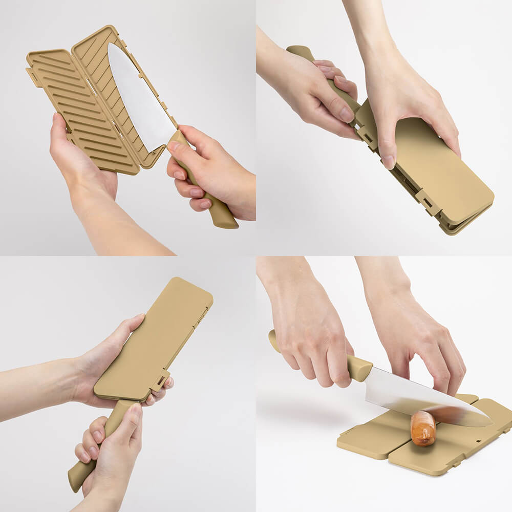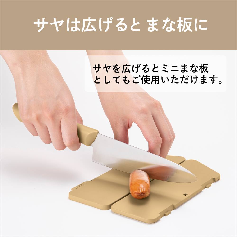 アウトドアシーンでも活躍するサヤ付きの包丁シリーズ。サヤが大きく開閉するため、持ち運び用だけでなく簡易まな板としても使用できます。