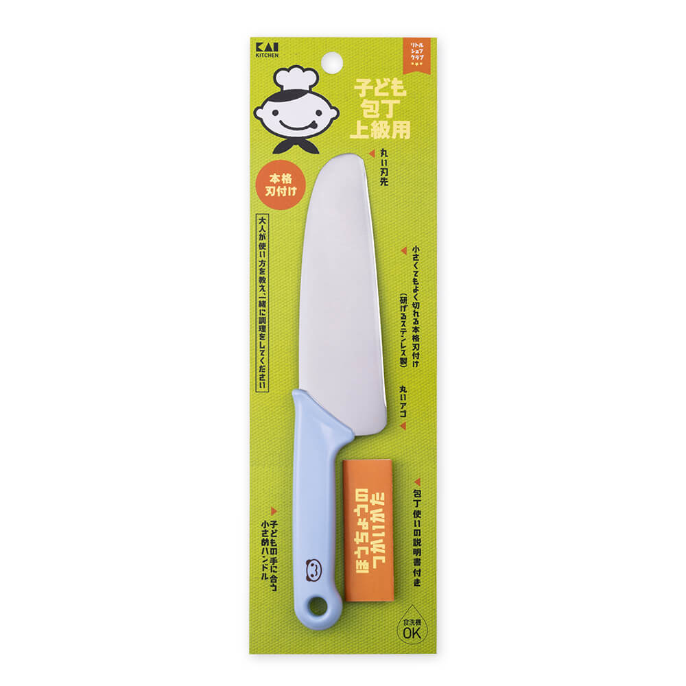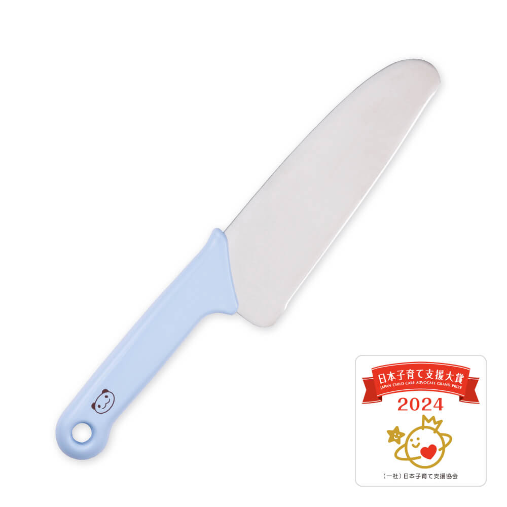 アゴと刃先を丸くした、けがをしにくい形状。きちんと切れるので、皮むきや薄切りなどの練習に最適です。