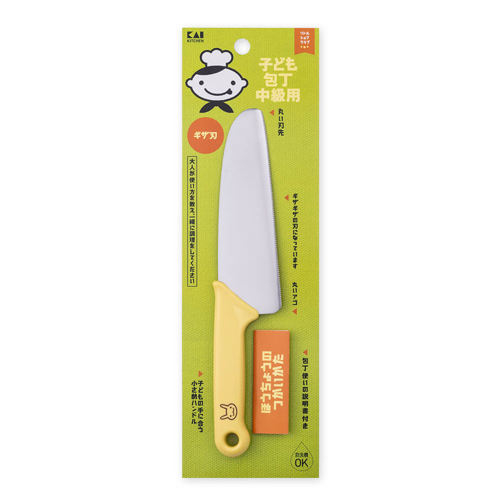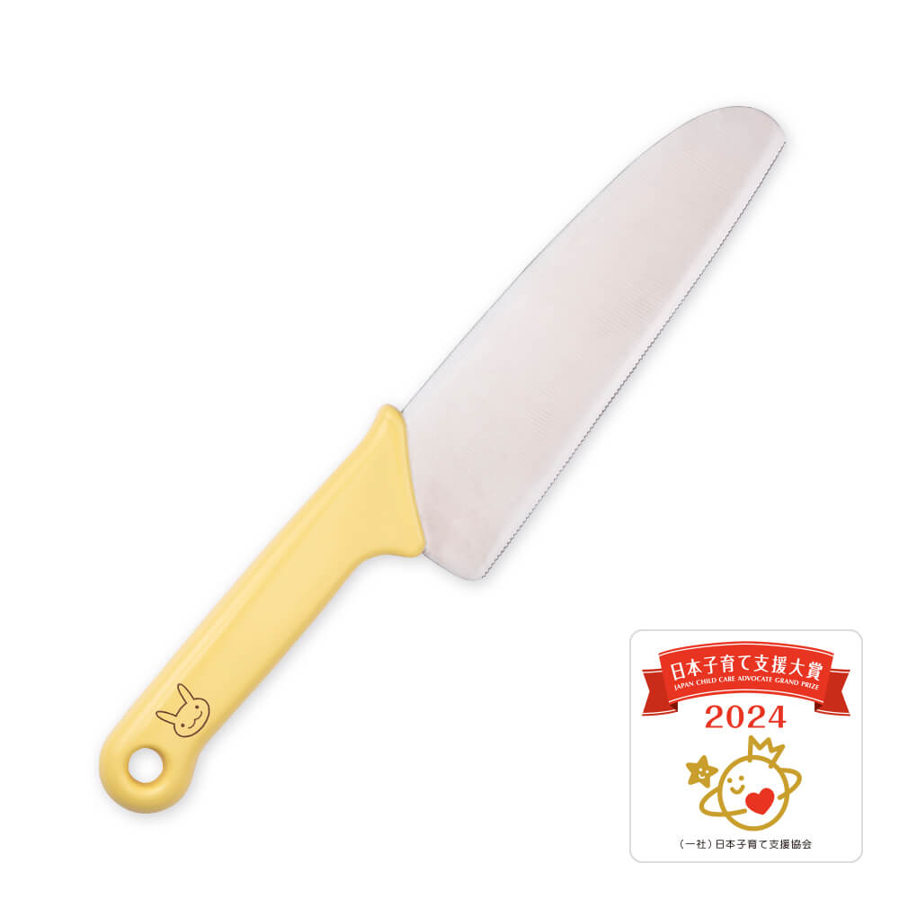 アゴと刃先を丸くした、けがをしにくい形状になっており、先のギザギザで食材を切ります。