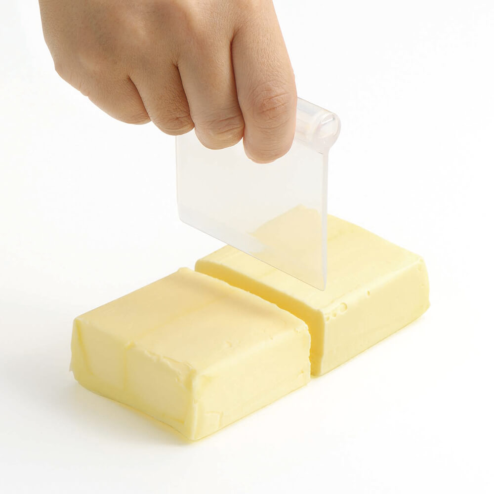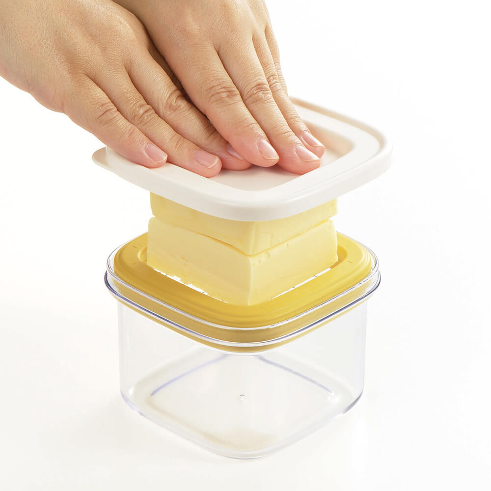 冷蔵庫から出したばかりの冷たくて硬いバターを手を汚さずに軽い力でカットでき、そのままコンパクトに保存できるケースです。バターは約5gにカットできるので、バターの計量が必要なお菓子作りやホームベーカリーの際に重宝するほか、常温に戻さずに軽い力で見た目もキレイにカットすることができます。保存容器としては、ピタッと密閉できるフタで、バターの酸化や匂い移りが気になりません。奥行約115mm、高さ約78mmと冷蔵庫に納まりやすいコンパクトサイズとなっています。