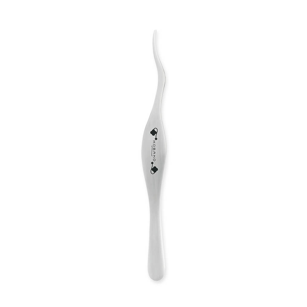 4)KOBAKO のロゴに対して下側のゆるやかなカーブを使い、まぶたのキワ全体にアイラッシュを固定させていきます。