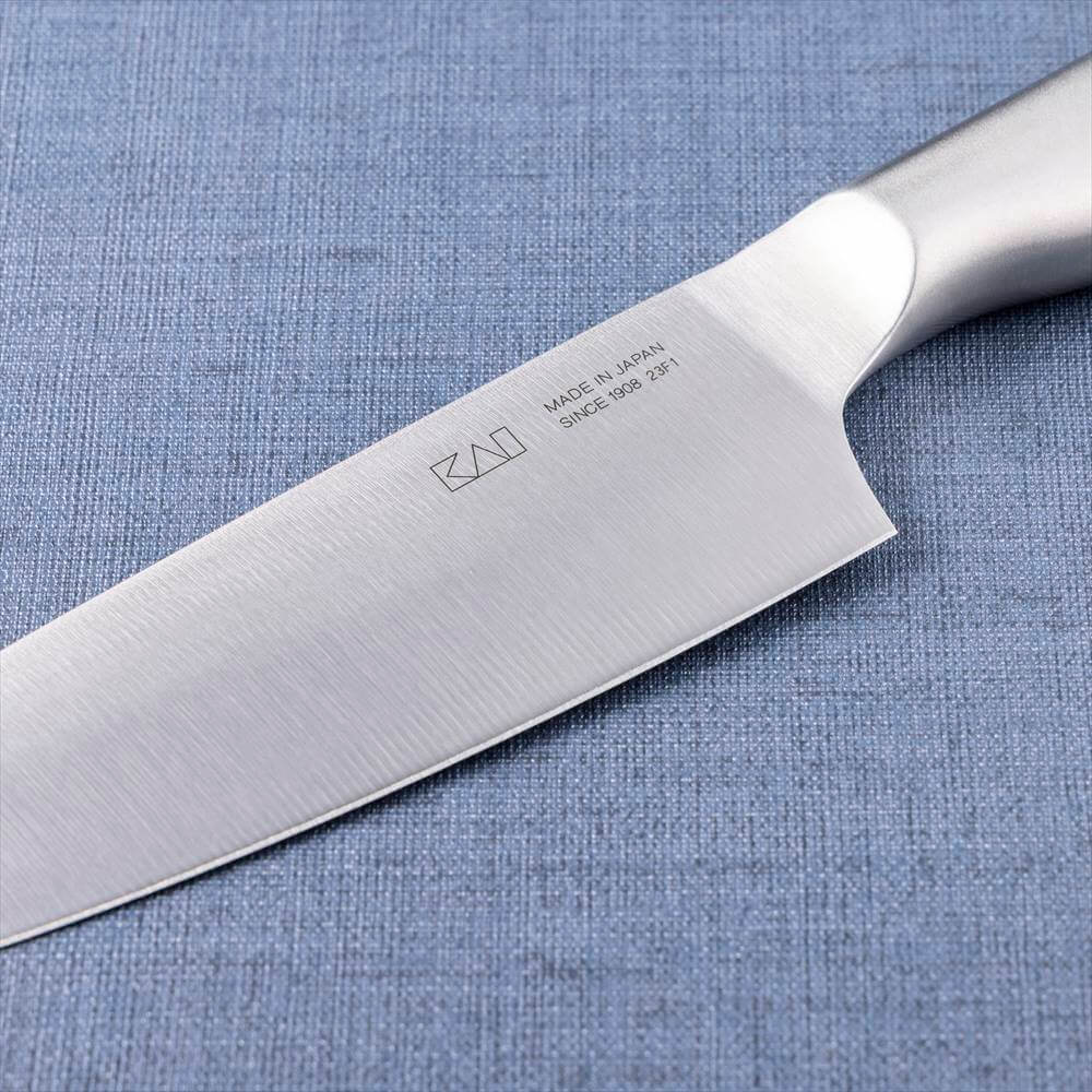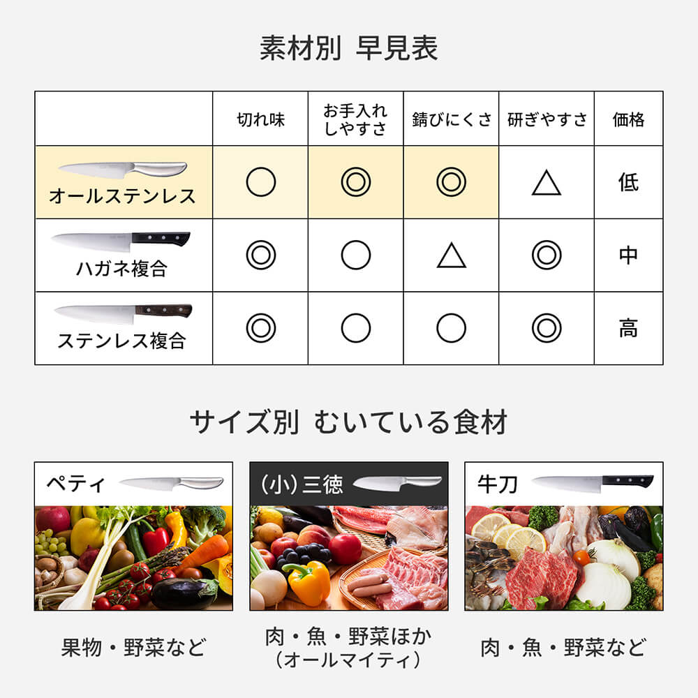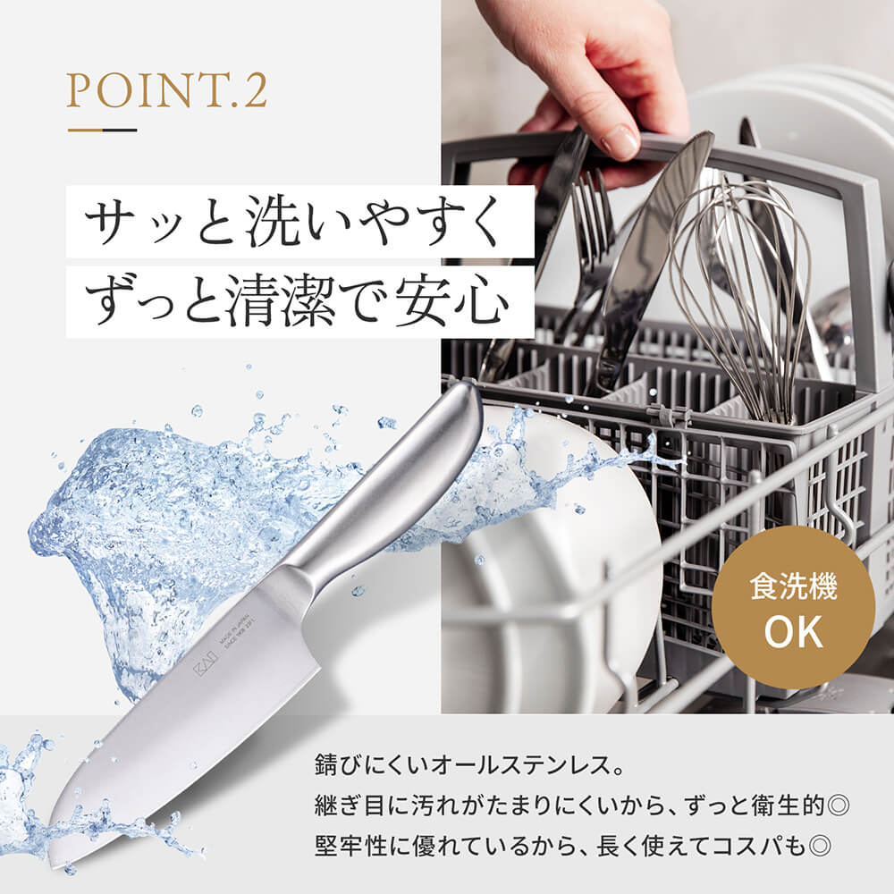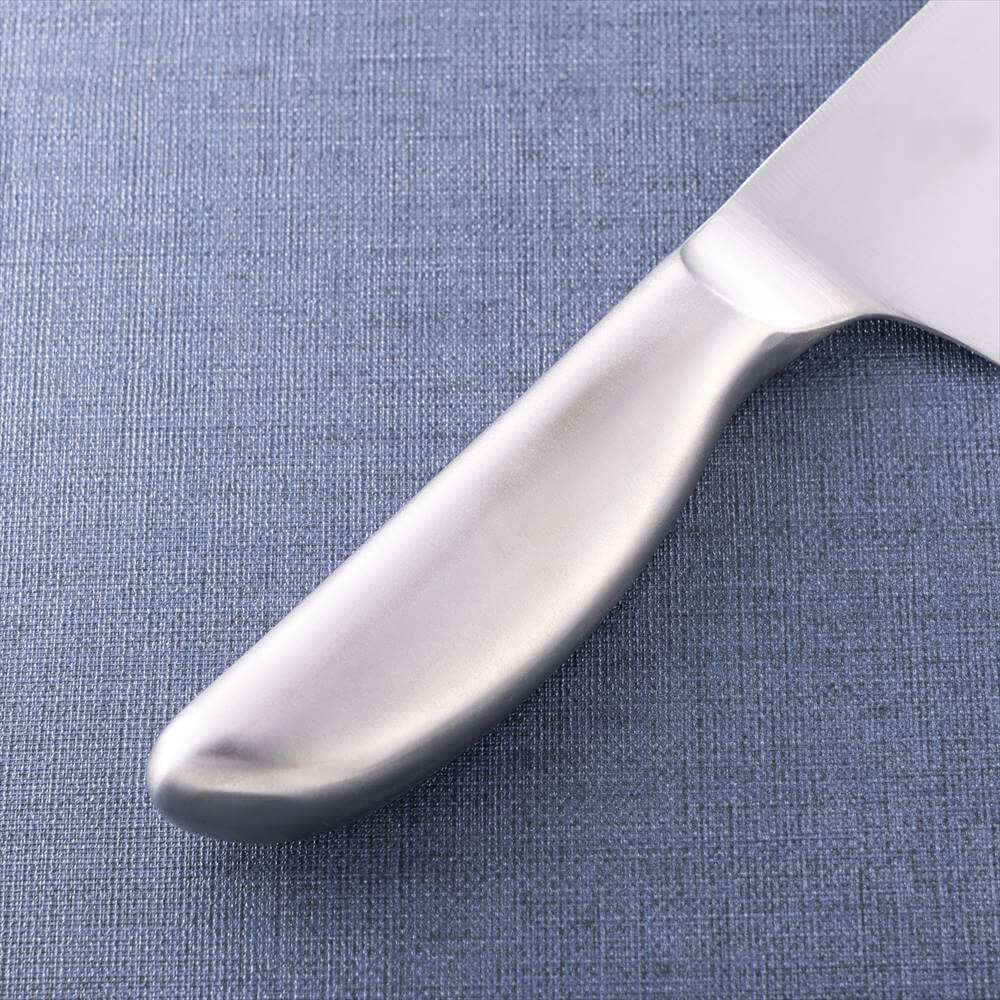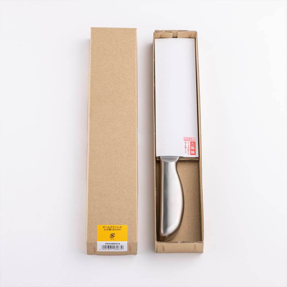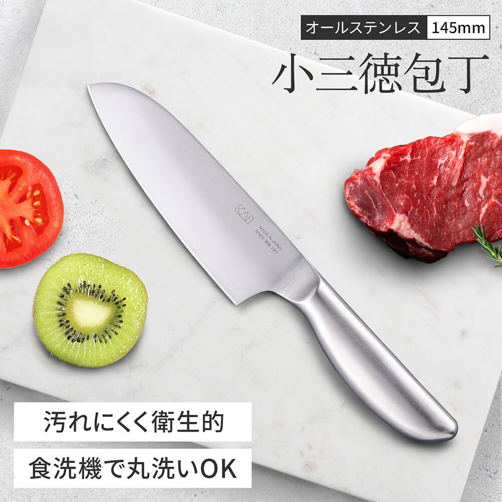 オールステンレスで持ち手まで一体型で洗いやすい形状の小三徳包丁(145mm)。食器洗い乾燥機対応で、お手入れも簡単です。
