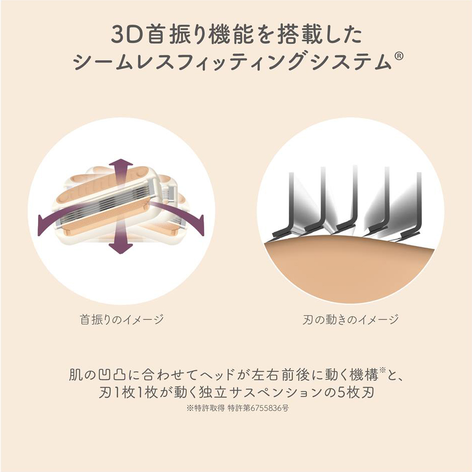 セルフケアの「わからない」「上手くできない」がなくなるように、わかりやすさや使いやすさ、肌へのやさしさにこだわりました。・刃部は肌の凹凸に合わせてヘッドが左右前後に動く首振り機構※1と、刃1枚1枚が動く独立サスペンションの5枚刃(シームレスフィッティングシステム®)