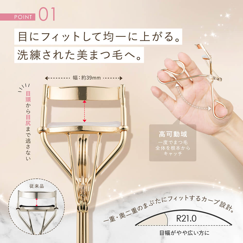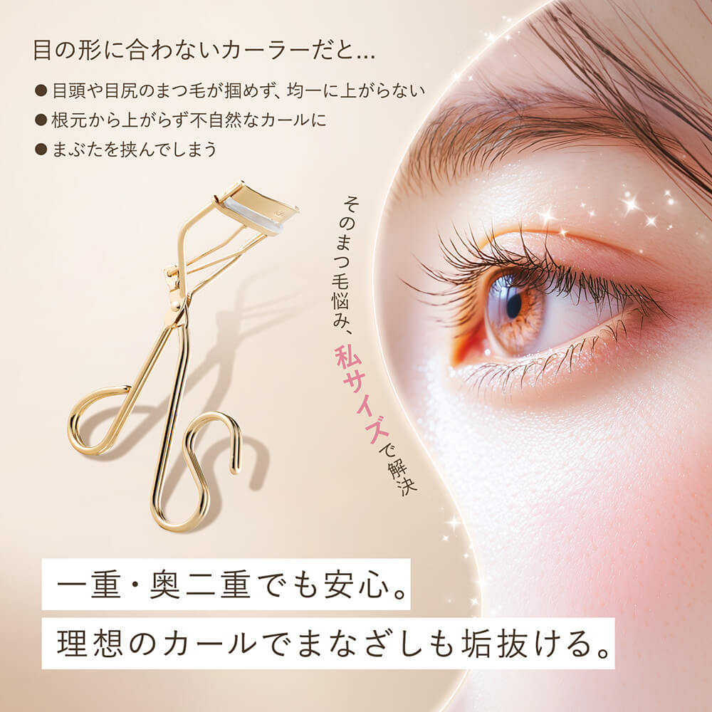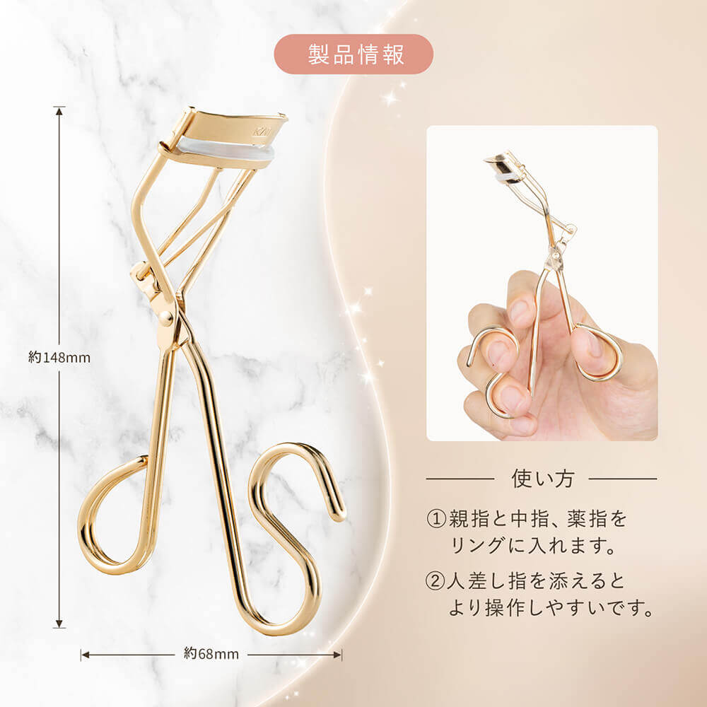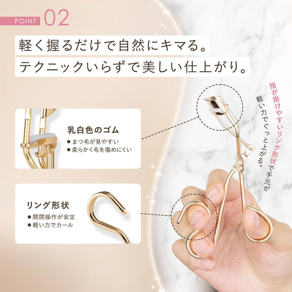 指がかけやすいリング形状&ダブルワイヤーで開閉操作が安定し、軽い力でカールすることができるアイラッシュカーラー