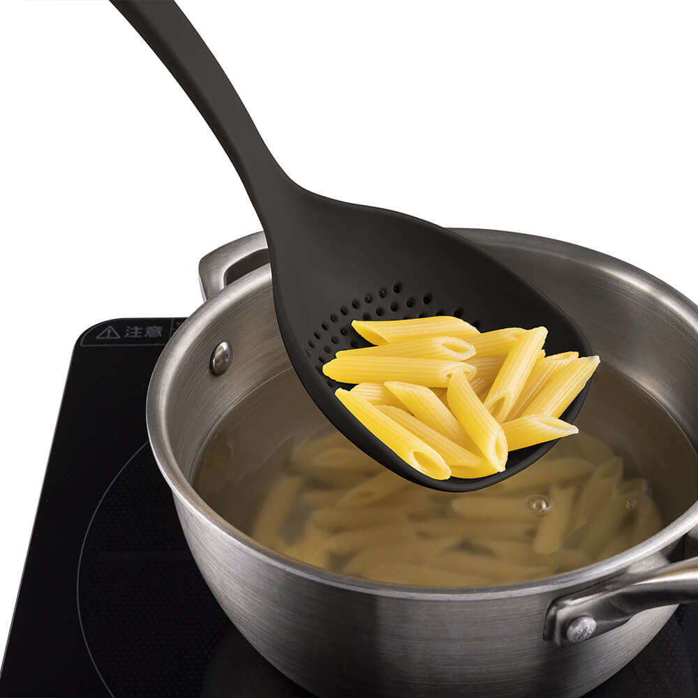 ・ナイロン一体成型で、継ぎ目や凹凸、部品もなくシームレスな形状でお手入れがしやすく、鍋やフライパンを傷つけにくいです。