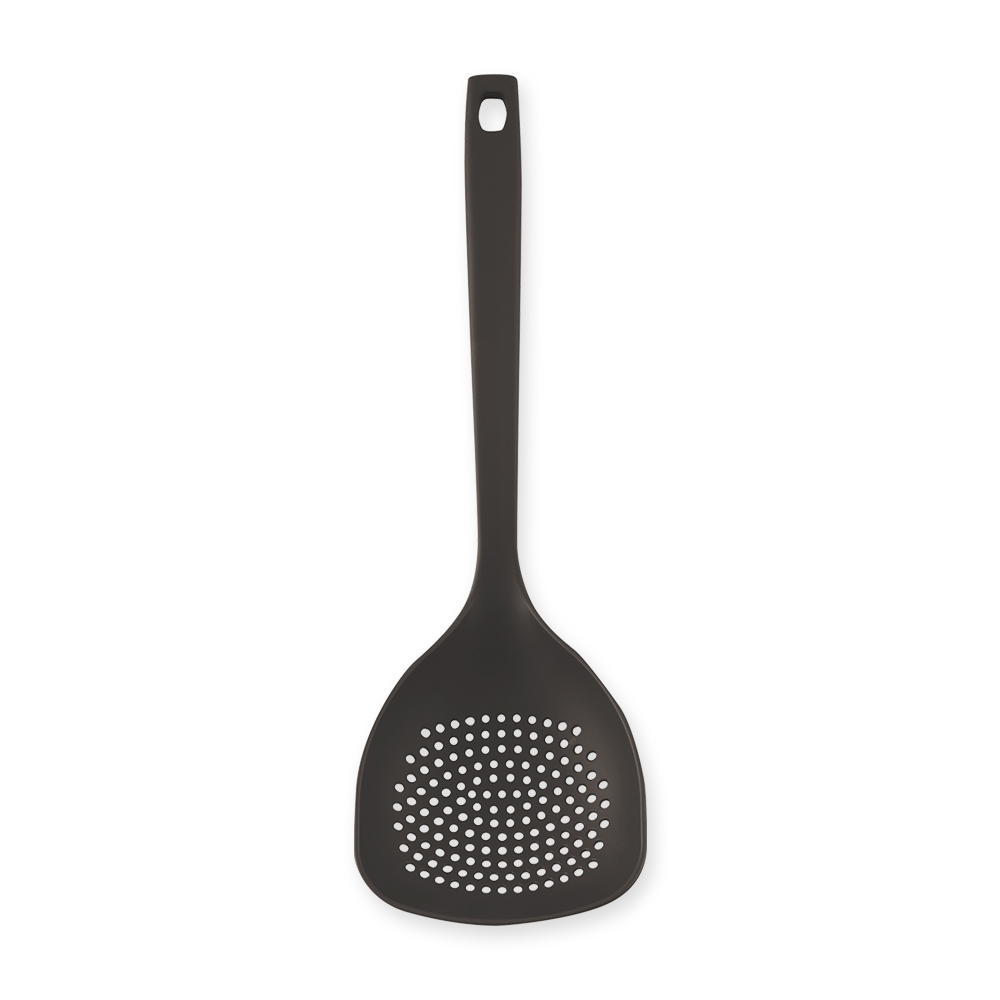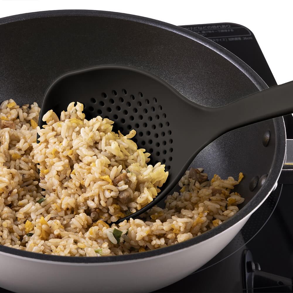 ・鍋の底をすくいやすい先端が平らな形状で炒め物にも便利。