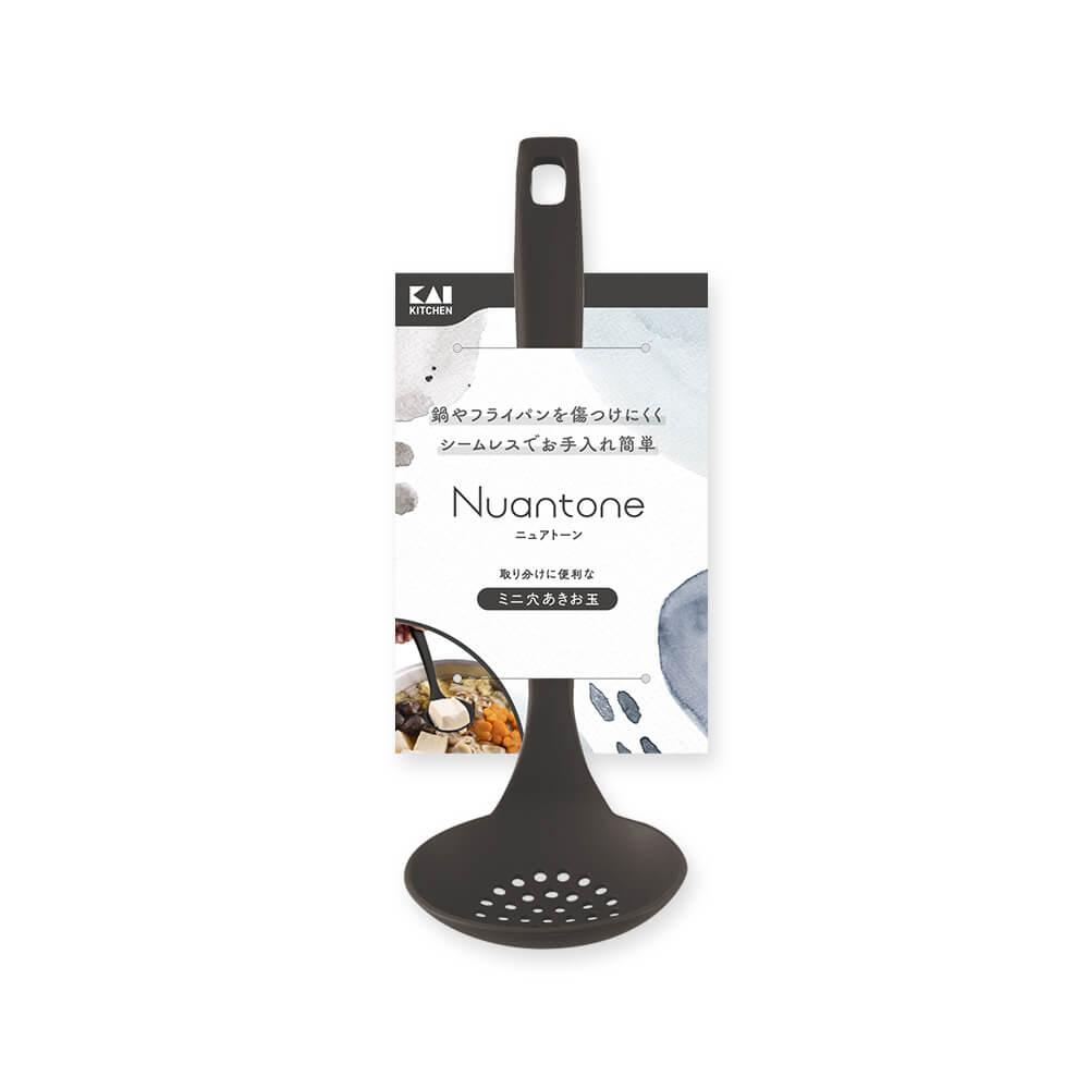 ・小さめサイズでかさばらない、取り分けに便利なミニ穴あきお玉。・鍋のフチにかけられる突起付き。