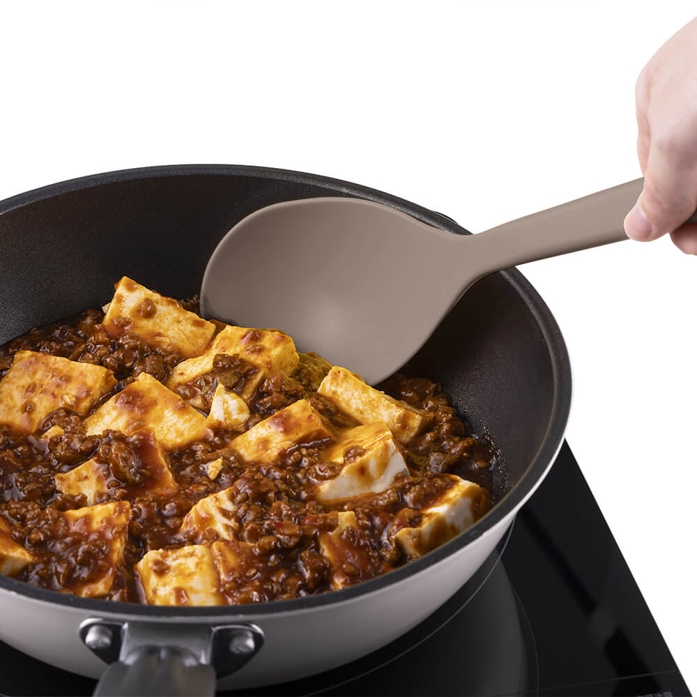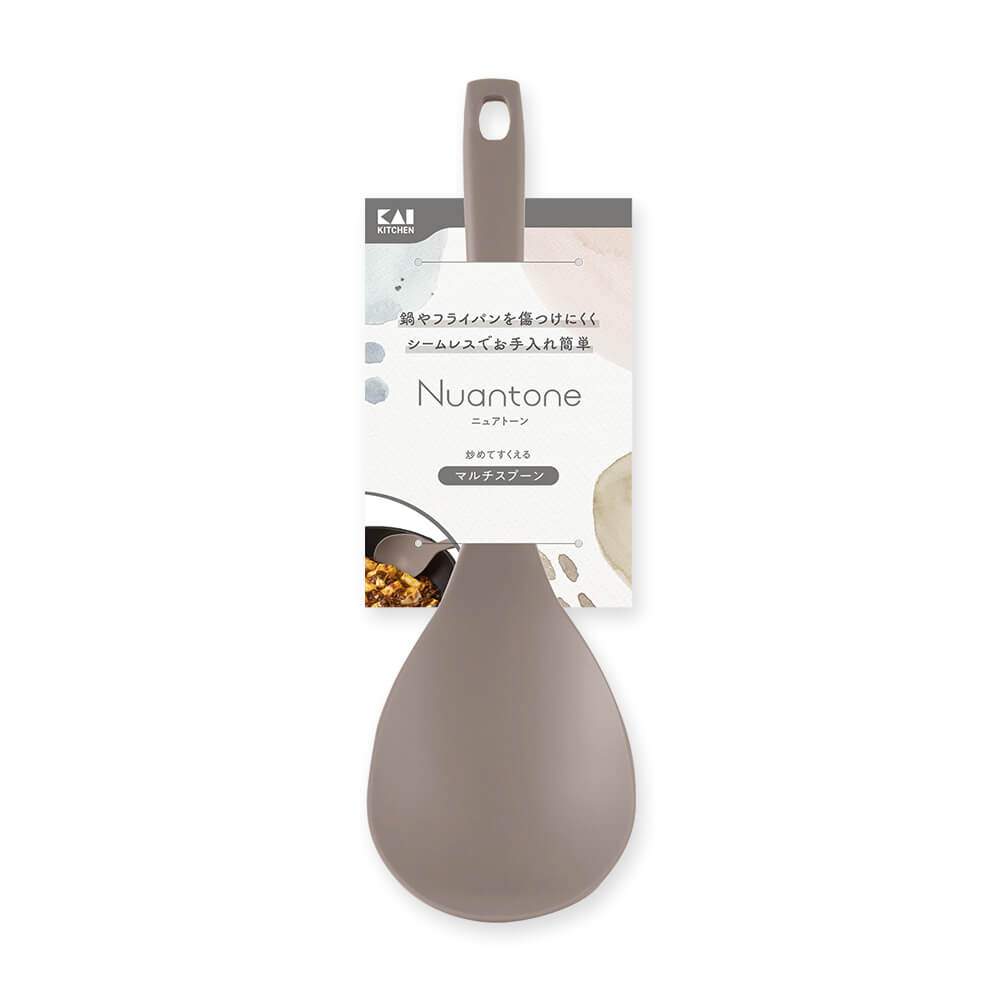・炒めてすくって取り分けられるマルチスプーン。・ナイロン一体成型で、継ぎ目や凹凸、部品もなくシームレスな形状でお手入れがしやすく、鍋やフライパンを傷つけにくいです。