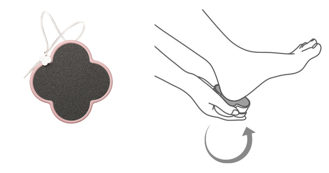 かかとが乾燥した状態のまま、ヒールファイルの粗目面(お花のマークがない面、#150)で円を描くように硬いかかとの表面を粗削りし、プレフットケアローションをかかとの角質に浸透しやすくします。STEP2
