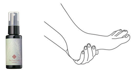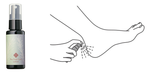 かかとにプレフットケアローションを約3プッシュ吹きかけ、かかとの角質に浸透させます。STEP3
