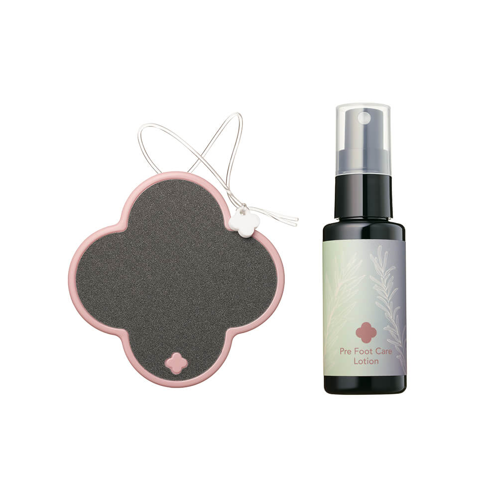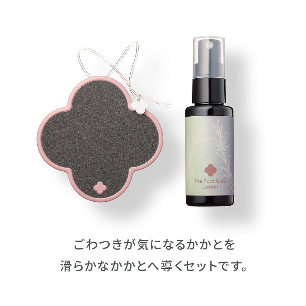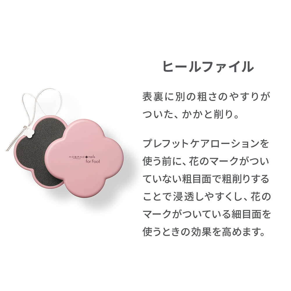 - かかとの角質を削るための「ヒールファイル」とかかとを削る前のプレケアや普段の保湿にも使用できる「プレフットケアローション」をセットした限定キット。かかとのごわつきが気になったときに、気軽にかかとケアにトライしやすい2アイテムで、ギフトにもおすすめです。プレフットケアローションはローズマリーとティーツリーを配合し、気分を高めるすっきりとした爽快感のあるハーブの香り。◆プレゼント付きの商品は こちら