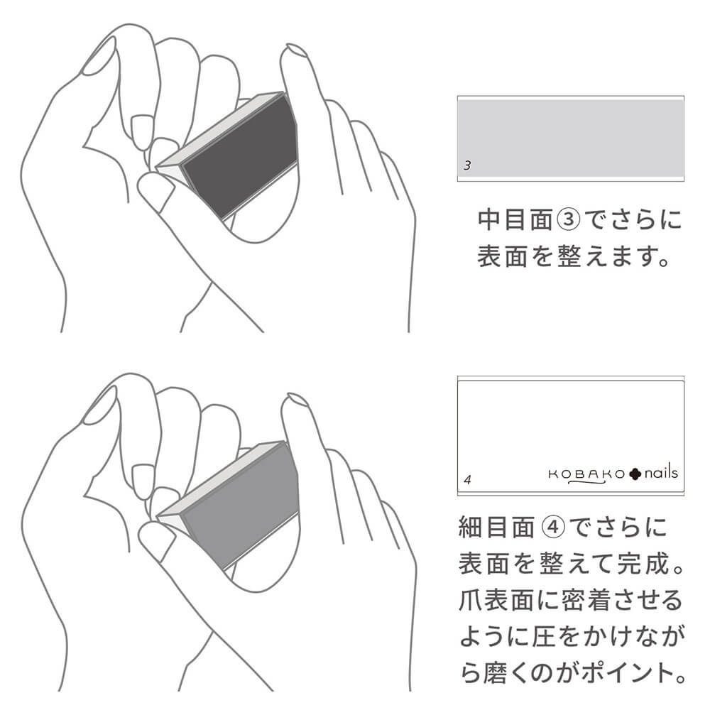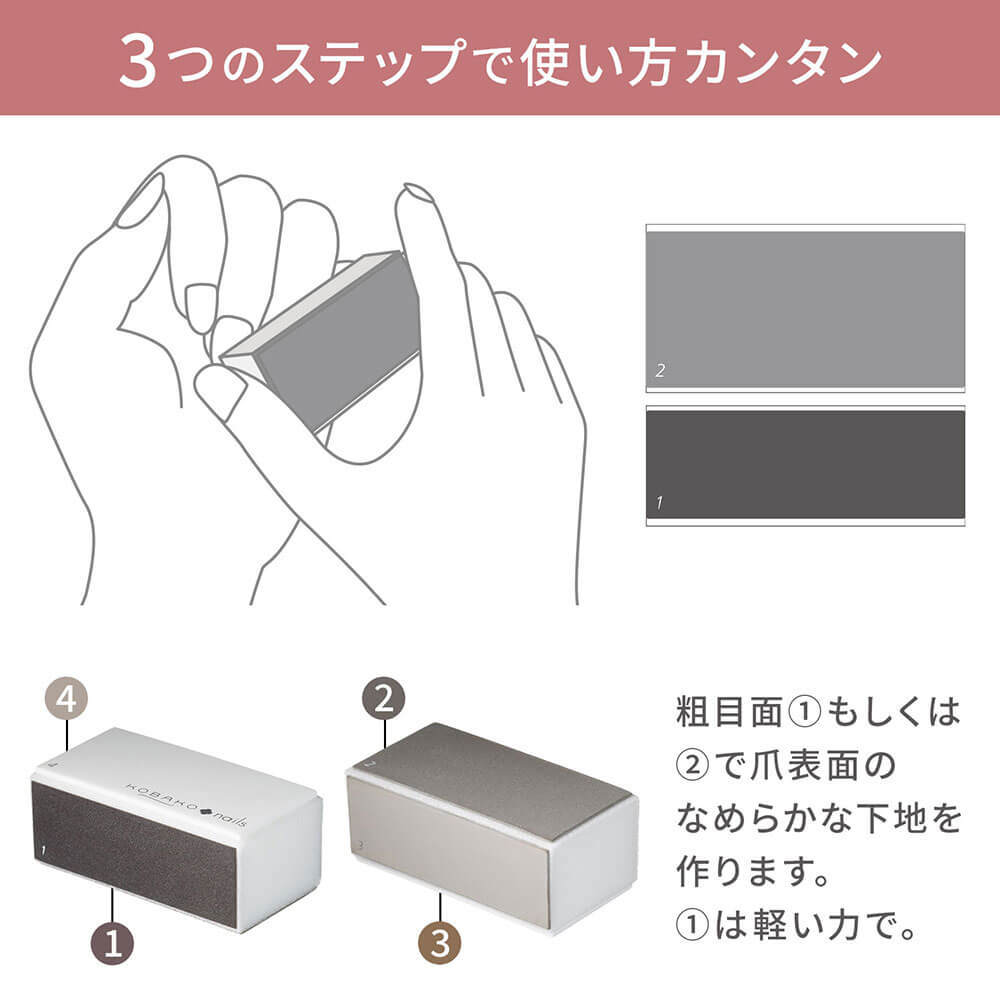 4つの面に配されたそれぞれ粗さの違う素材で順番に磨いていくだけで、表面の凹凸をきれいに取り除き、ピカピカの爪に仕上げるブロック型のネイルバッファー。爪表面との接触面積を広く取って、少しの力で一気に磨くことができるよう、中芯の弾力を調整し、絶妙なしなりを実現しました。3個入り。