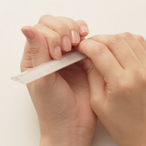 ネイリストのファイリング技術をヒントに開発した、独自設計のネイルファイル。ファイルに爪先、指の腹をあて、左右に動かしていくだけで、すべての爪を均一に整えることができます。削るときは左右に、仕上げは、同じ方向に3回動かすとさらに滑らかな仕上がりに。
