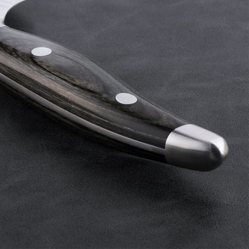 70層にも折り重ねられた2種類の高級鋼材から成る刃体は、美しい模様を作り出すだけでなく、