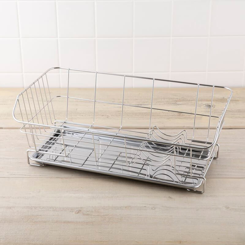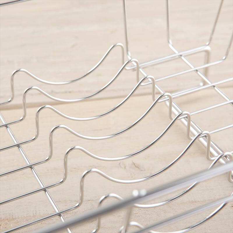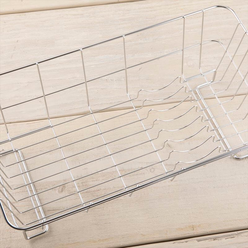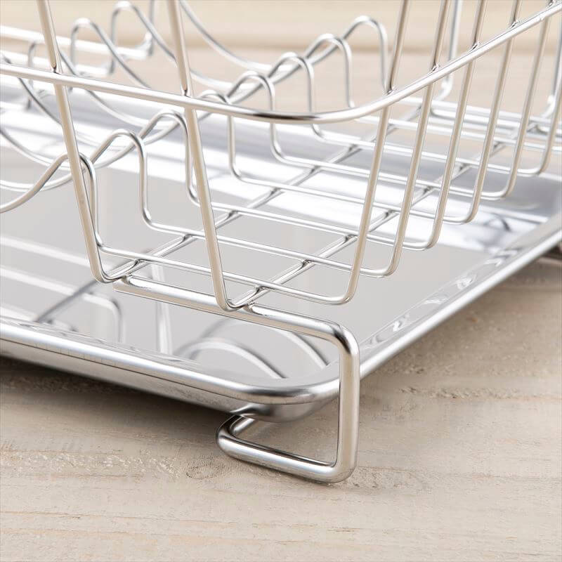 足高で、太くて丈夫な構造。コップやお椀も転がらずに立てられるM字型スタンドで、水切りが楽なスライドトレイです。