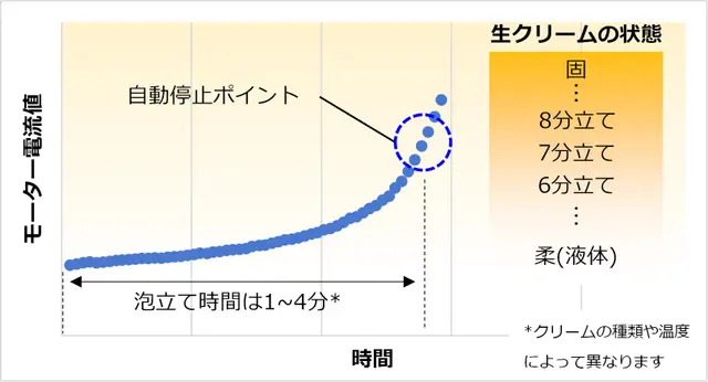 生クリームが液状のときはモーターへの負荷は低く、モーター電流値が低いのですが、生クリームが泡立って固くなると負荷が大きくなりモーター電流値が高くなります。この原理を応用したアルゴリズムを用いています。