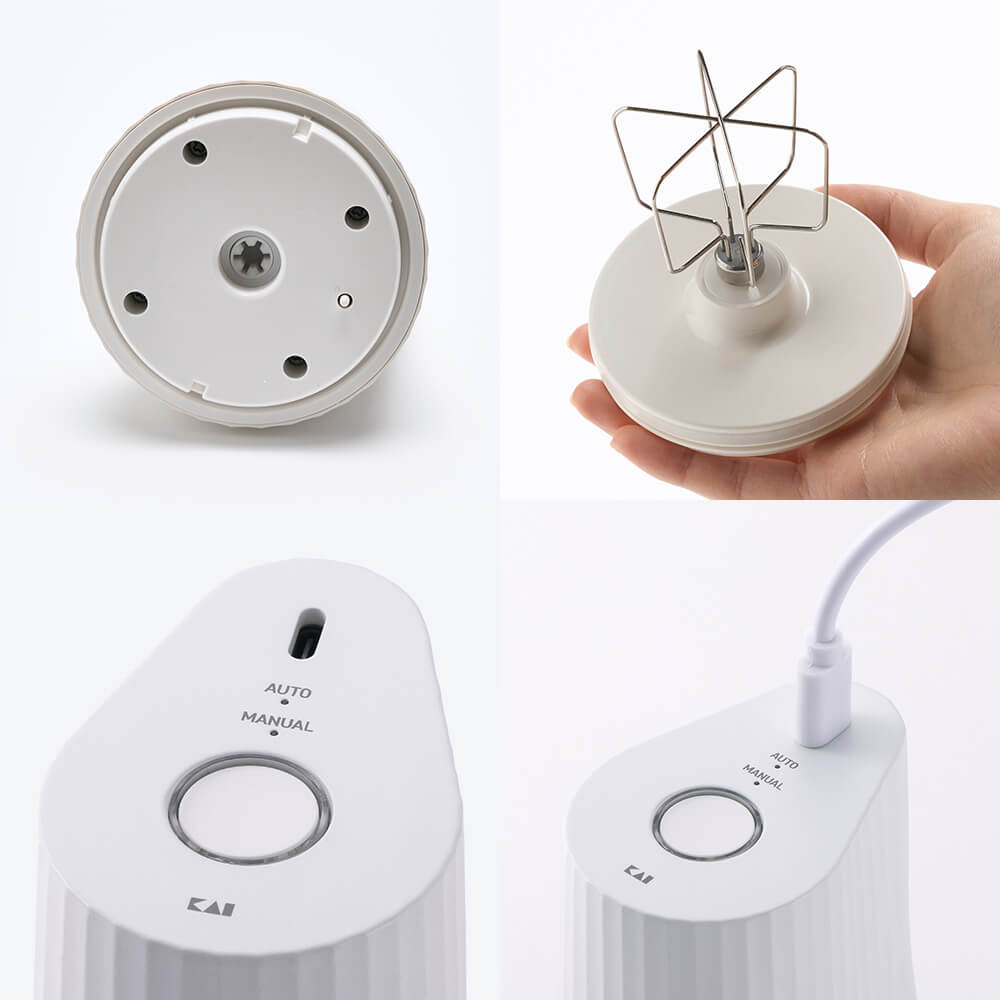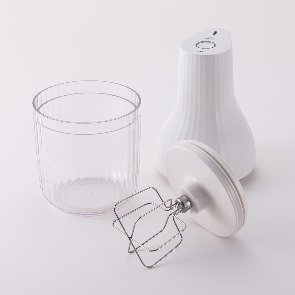 泡立て具合を検知して自動で7~8分立てに泡立てます。泡立て具合が足りないと感じたら、手動での調整も可能です。カップ一体型の設計なので、クリームが周囲に飛び散る心配もありません。手のひらサイズでUSB-C充電式なので、持ち運びやすくどこでも使用できます。