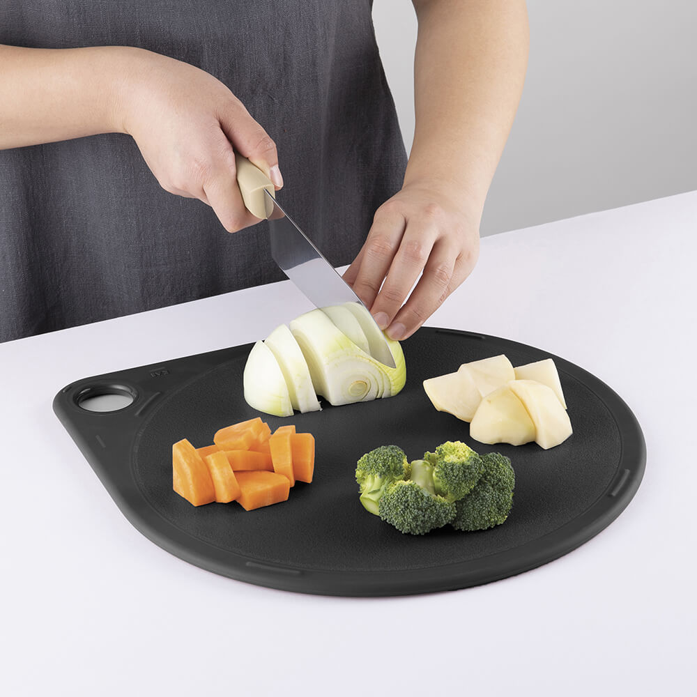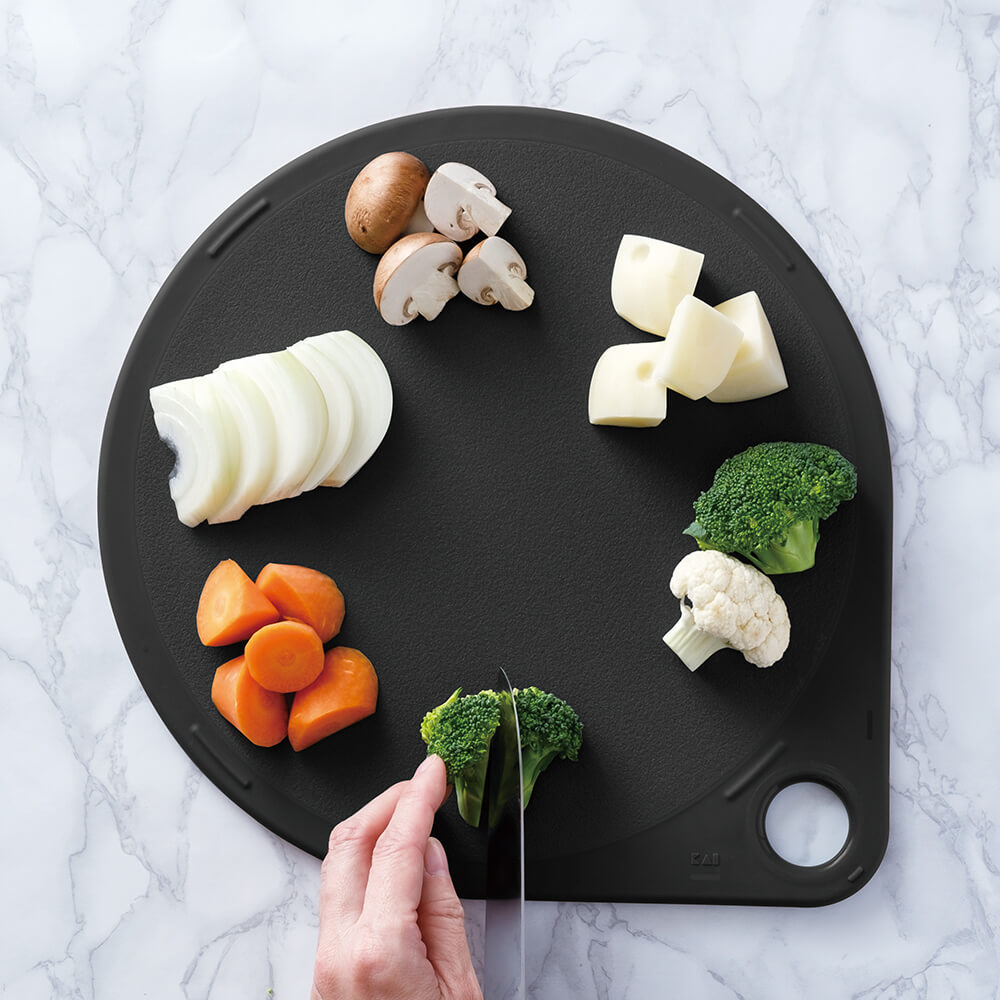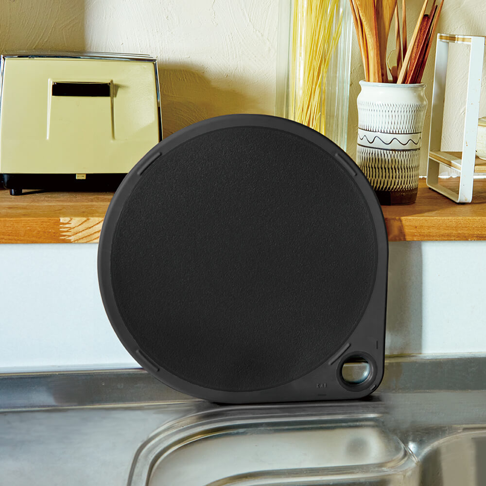 まな板を回転させることで、切った食材を仮置きしたまま使用でき、洗い物も軽減。また直線部分を設けることで転がりにくく倒れにくい、立てかけ収納が可能な形状になっています。