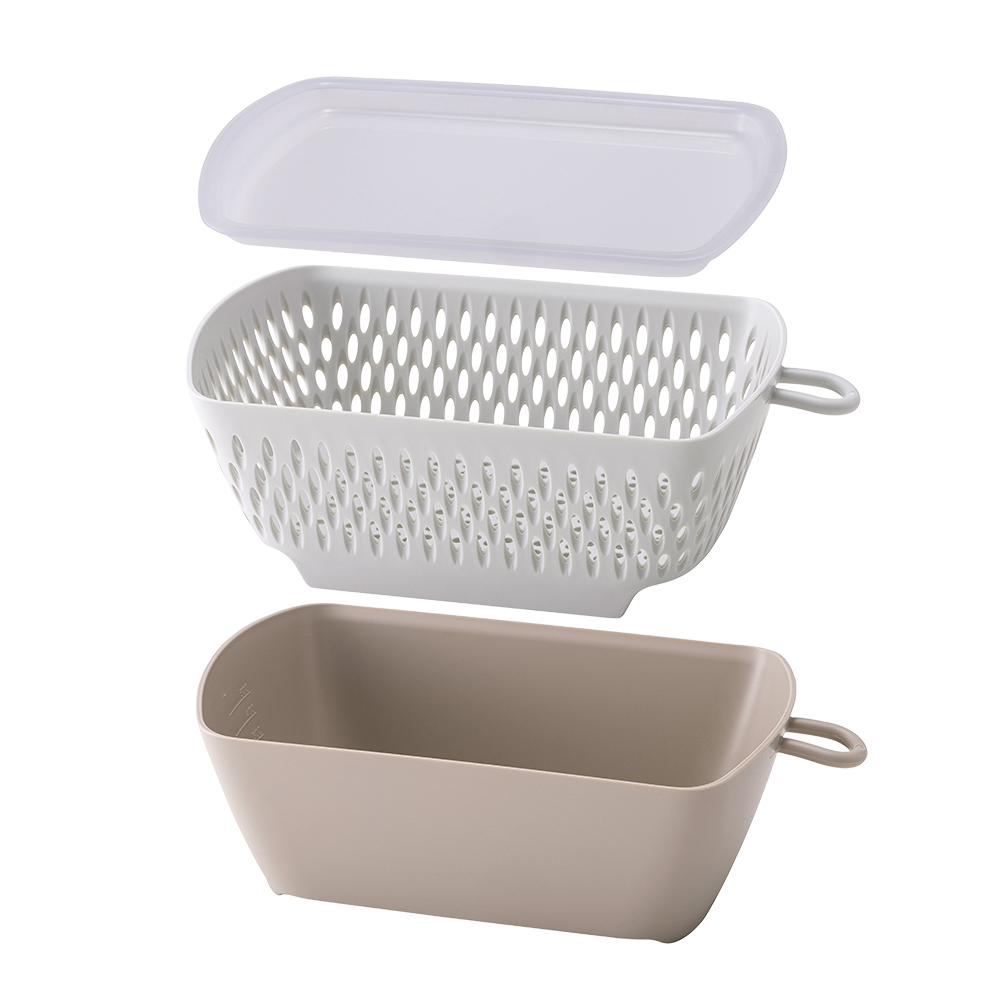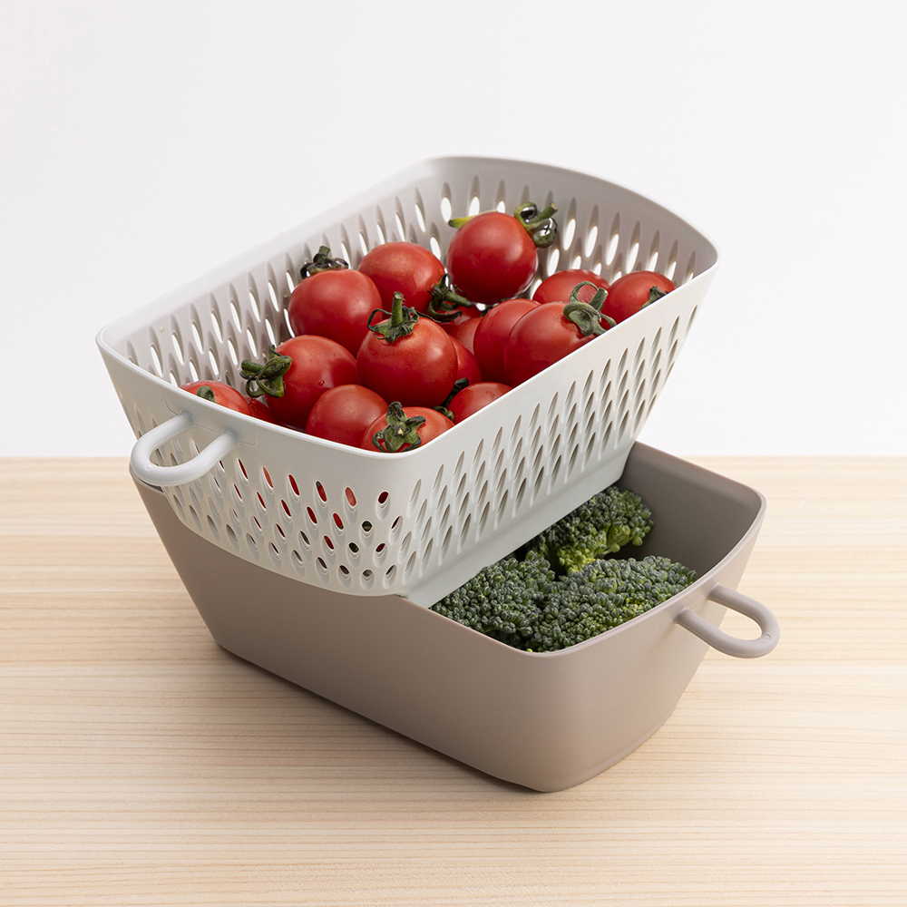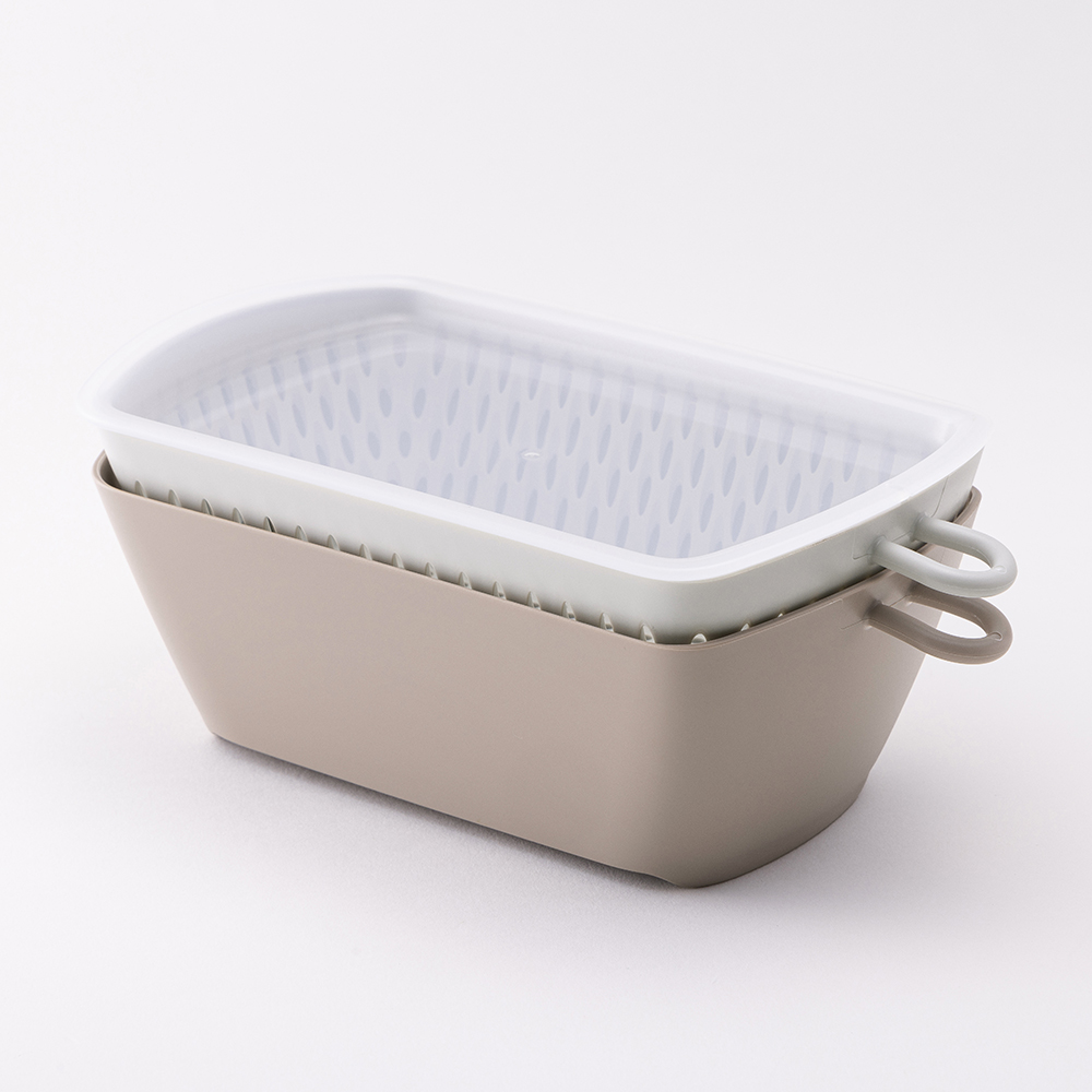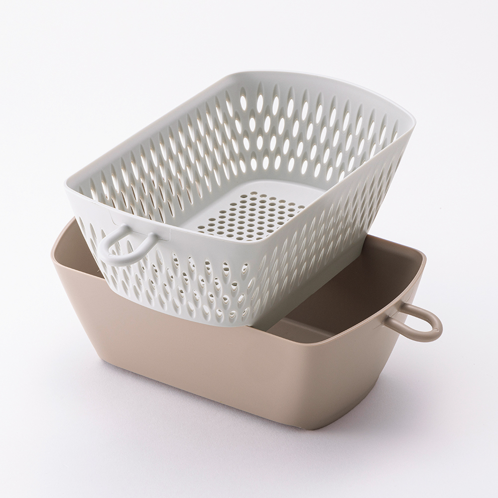 ・コンパクトに重ねてしまえる、バット・ざる・フタのセット。