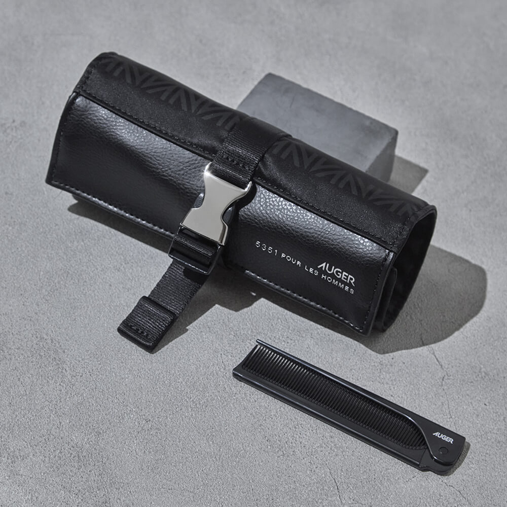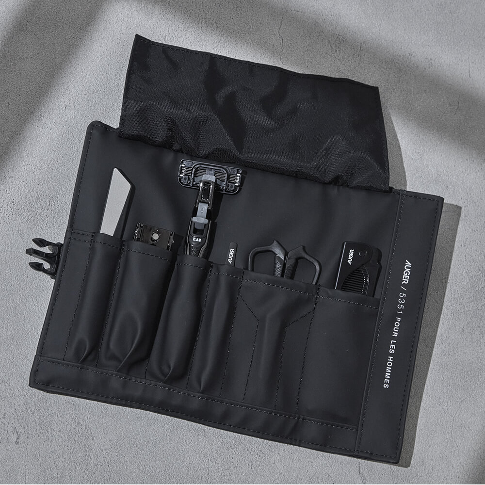 コラボレーション第3弾となる「コラボロールポーチ付き限定セット」は、「AUGER」のシステムカミソリ、ツメキリM Revolver、セーフティハサミ、オシャレハサミ、毛抜き、ネイルファイル、セットコーム(折りたたみ)※1と、それらを収納できる「5351POUR LES HOMMES」のオリジナルポーチ※2の計8アイテムがセットになった限定商品です。外出先や旅先でも心地よい豊かな時間を提供することをコンセプトにしたセットで、このポーチ一つで「身だしなみを整える時間」を心地よい豊かな時間へと変えるアイテムとなっております。