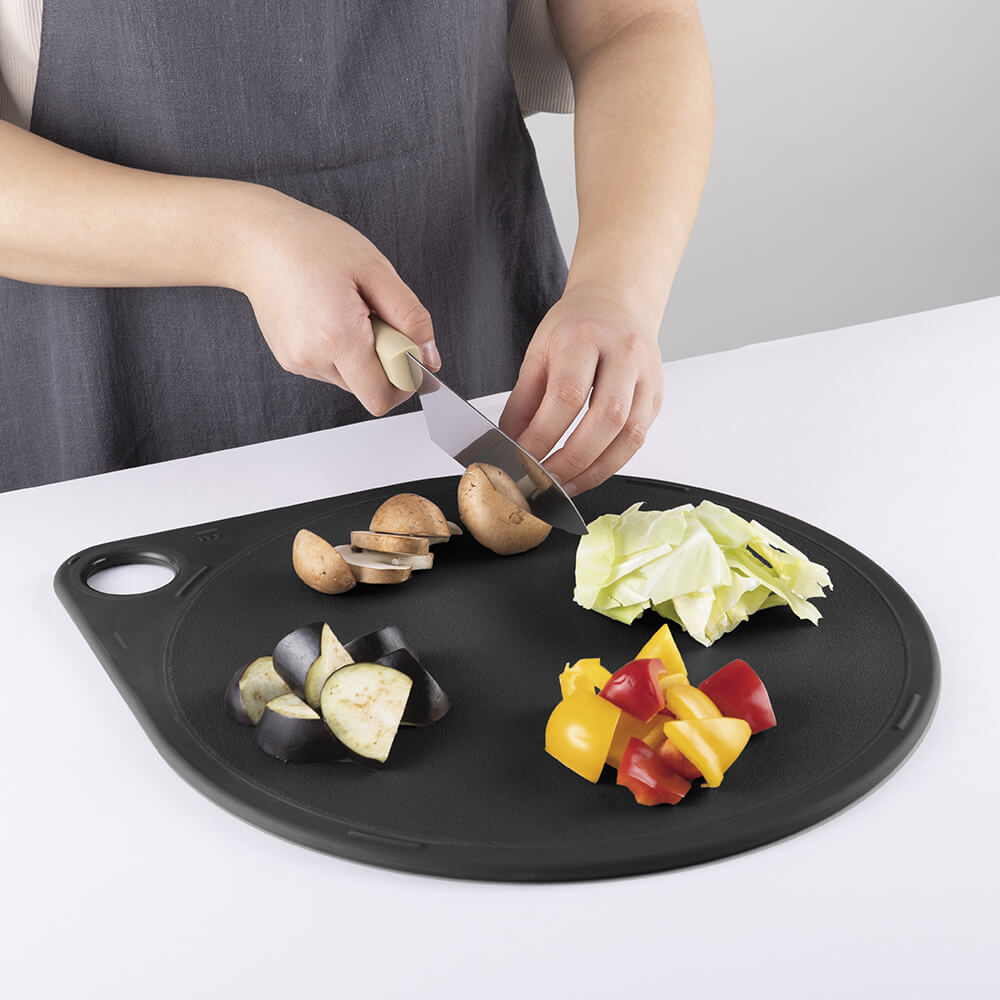 奥行きたっぷり、ひろい作業スペースが魅力のまるいまな板です。