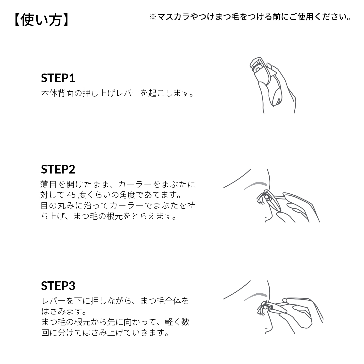 まつ毛の根元から先に向かって、軽く数回に分けてはさみ上げていきます。②ホットアイラッシュカーラー