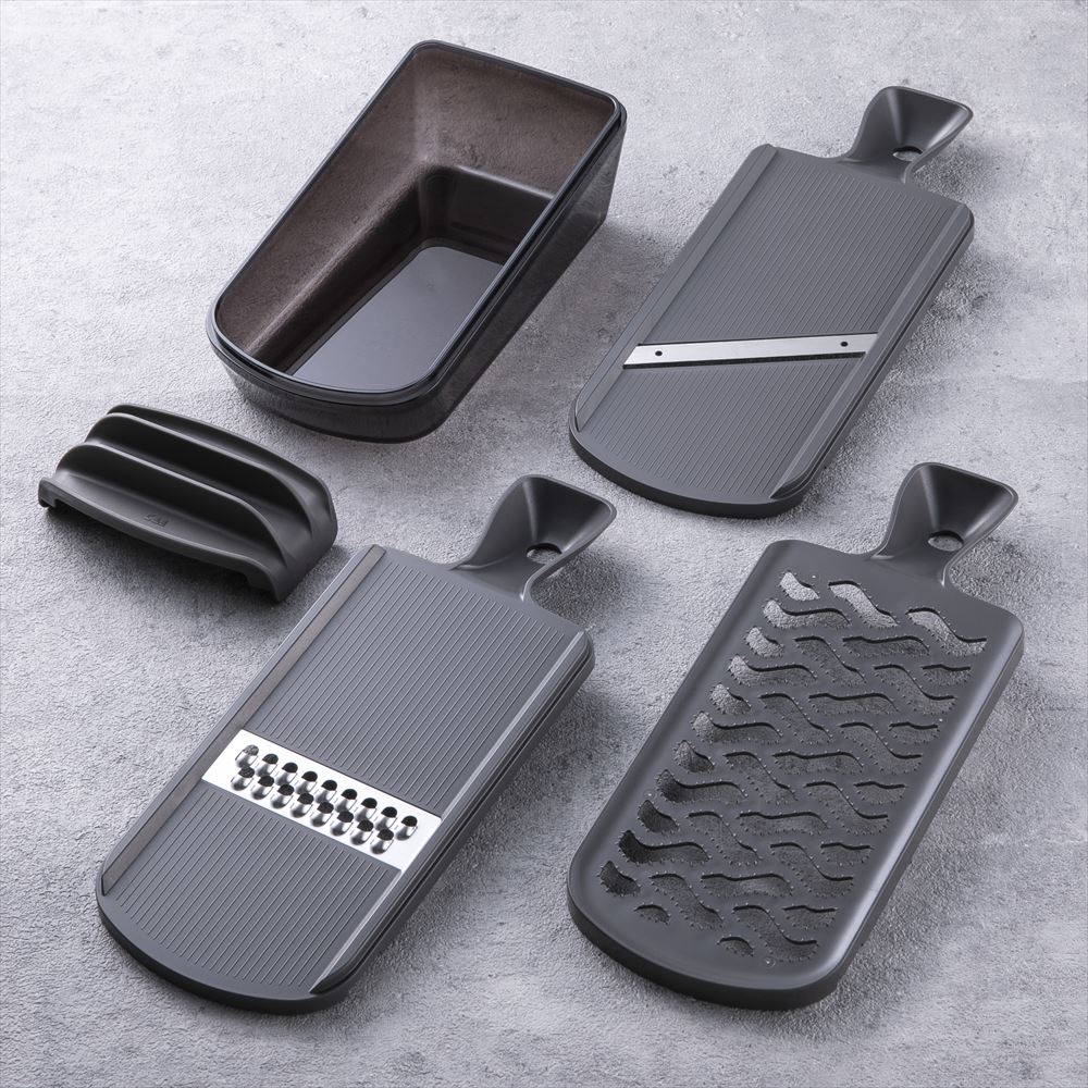 ・分解して洗えるので衛生的。【コンパクト調理器セット(両刃スライサー、千切り、おろし、指ガード)】