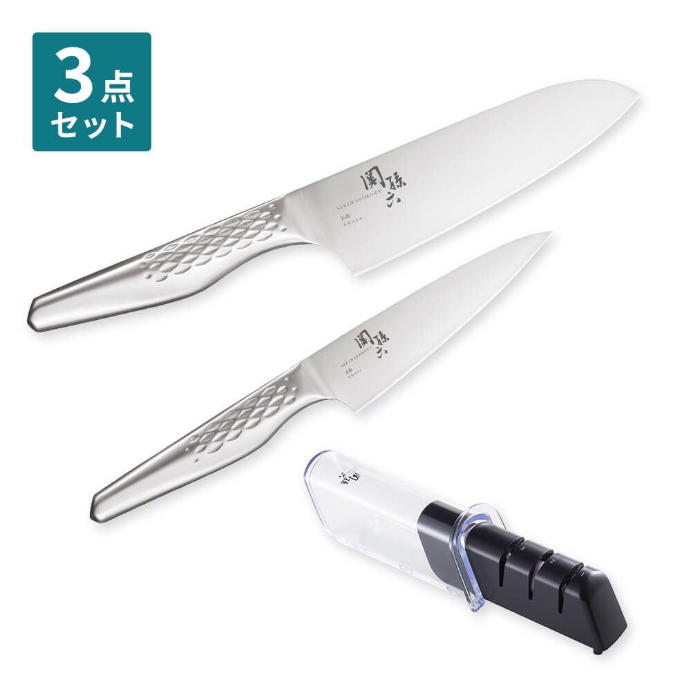 爽快な切れ味の関孫六 オールステンレス製包丁2種と、切れ味を簡単に蘇らせることができるシャープナーを組み合わせた、実用性抜群のお得なセットです。