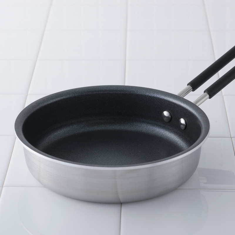 - 表面加工:内面/ふっ素樹脂塗膜加工 本体/アルミニウム合金/ステンレス鋼(クロム18%)(底の厚さ2.5mm) 取っ手/ステンレススチール(一部シリコーンゴム被覆/耐熱温度230℃)