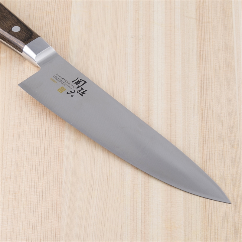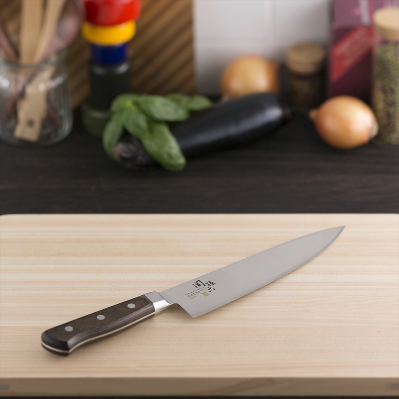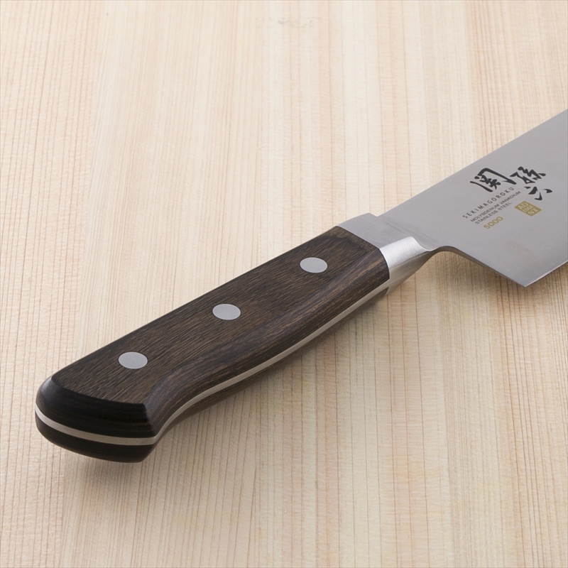 こだわり仕様の「本格刃付け」仕上げに新しく技術開発された「スキ」と「刃付け」を採用、鋭い切れ味とスピーディーな研ぎ直しを実現しました。本通し仕様ハンドル内部には、ステンレスがハンドルと同じ形状で通っている仕様です。重心がハンドルにありしっかりと握ることができるため、刃の重さが気にならず、思い通りの包丁さばきが実現します。一体口金ステンレスの口金と刀身を溶接することにより、水分やサビの侵入を完全にシャットアウト。フィット感の高い「積層強化木ハンドル」柄の素材には、天然木に特殊加工を施した素材を使用。木の持つ風合いをそのまま活かした、強度が高く、水にも強いハンドルです。