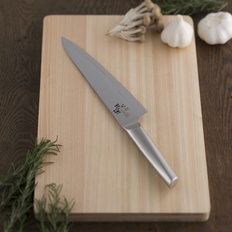 継ぎ目のないオールステンレス仕上げで、煮沸消毒、食器洗浄機にも対応。特殊精密接合(ろう付け)の技術を利用した機能性とスタイリッシュなデザイン。肉・魚の薄切りや切っ先を使った細工切り、刃先と刃元を振り子のように使ったみじん切りなど調理の幅を拡げる包丁です。