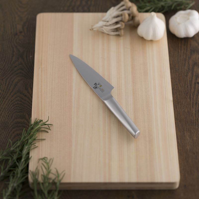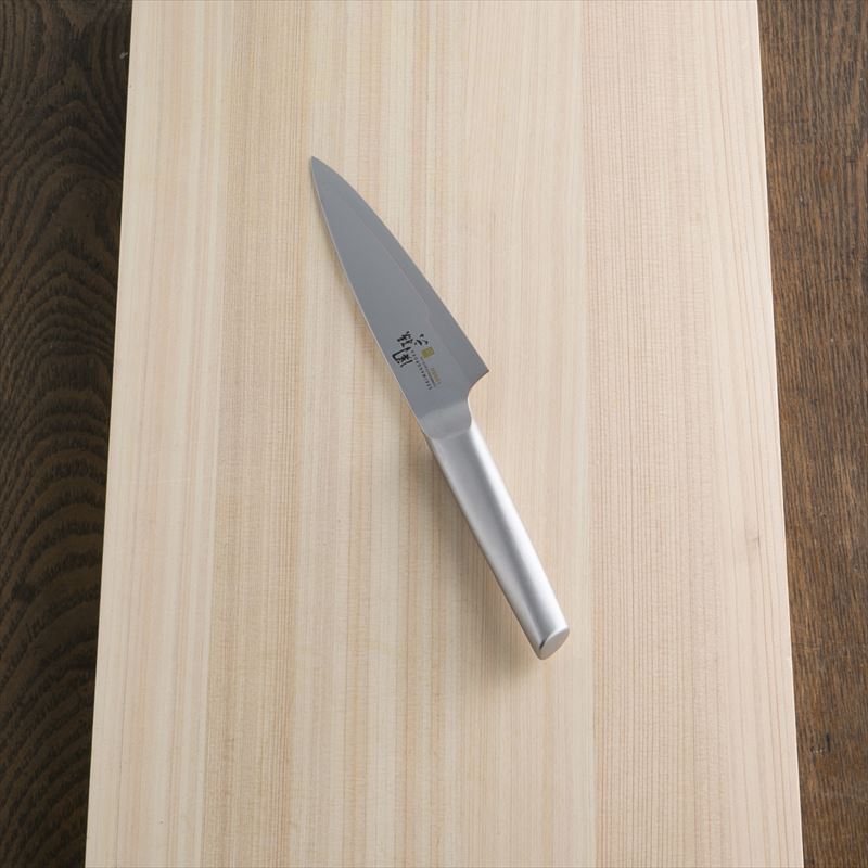 継ぎ目のないオールステンレス仕上げで、煮沸消毒、食器洗浄機にも対応。特殊精密接合(ろう付け)の技術を利用した機能性とスタイリッシュなデザイン。手元での細かい細工や皮むきに便利なサイズの包丁です。