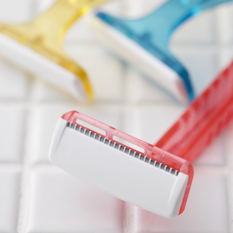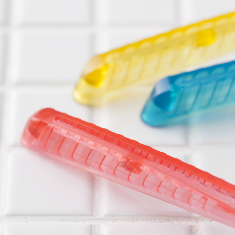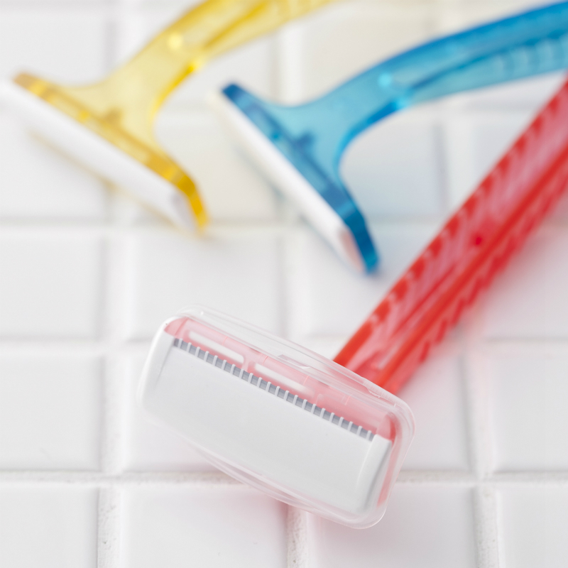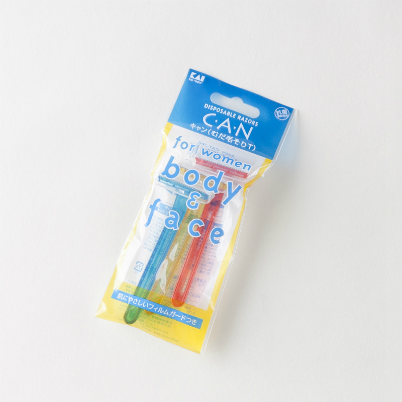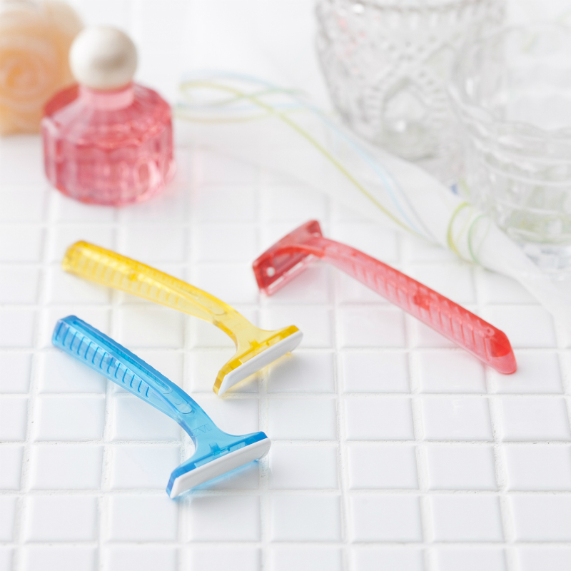 ワキや腕、脚等のボディーのお手入れ用カミソリ。刃は肌を痛めにくいクシ目状のフィルムガード付きです。クリアカラーの3色でとってもかわいいカミソリです。