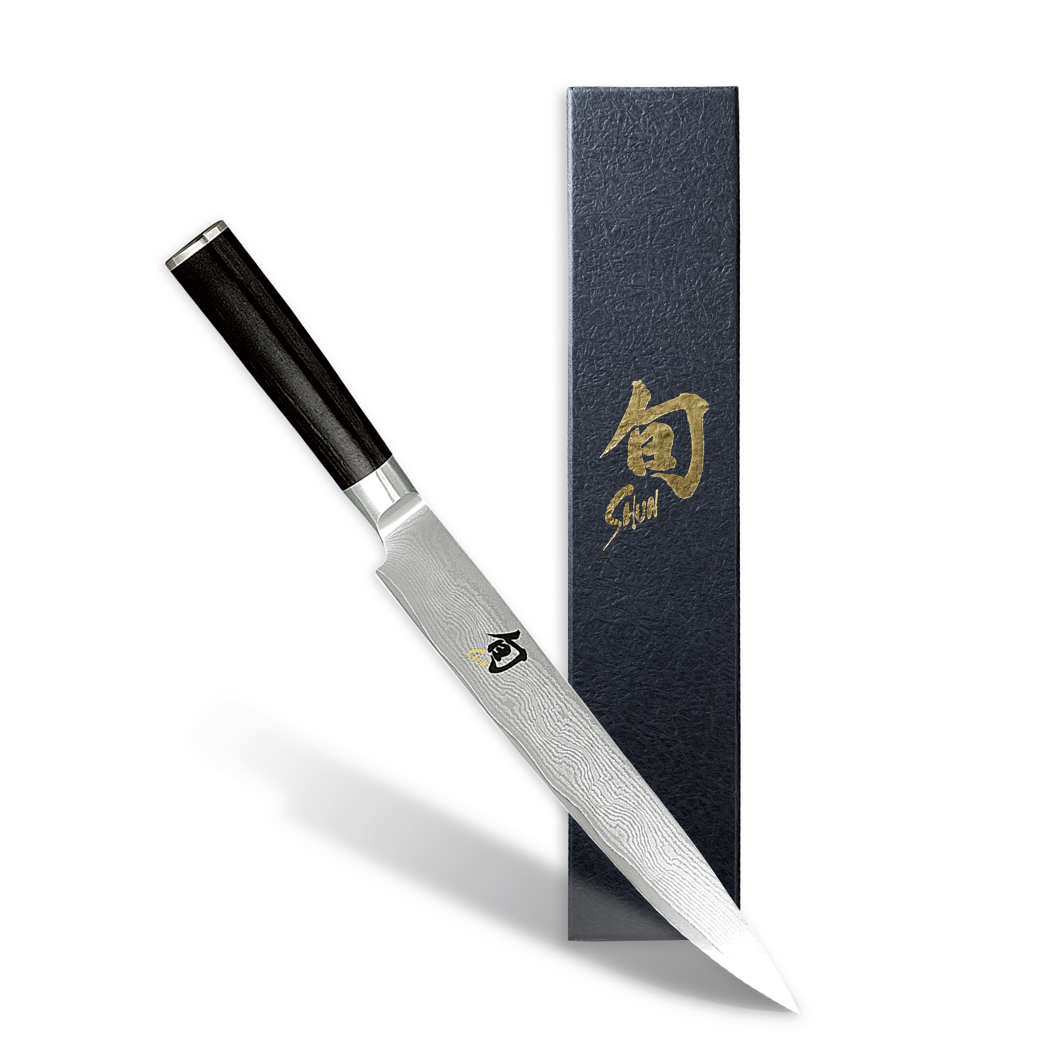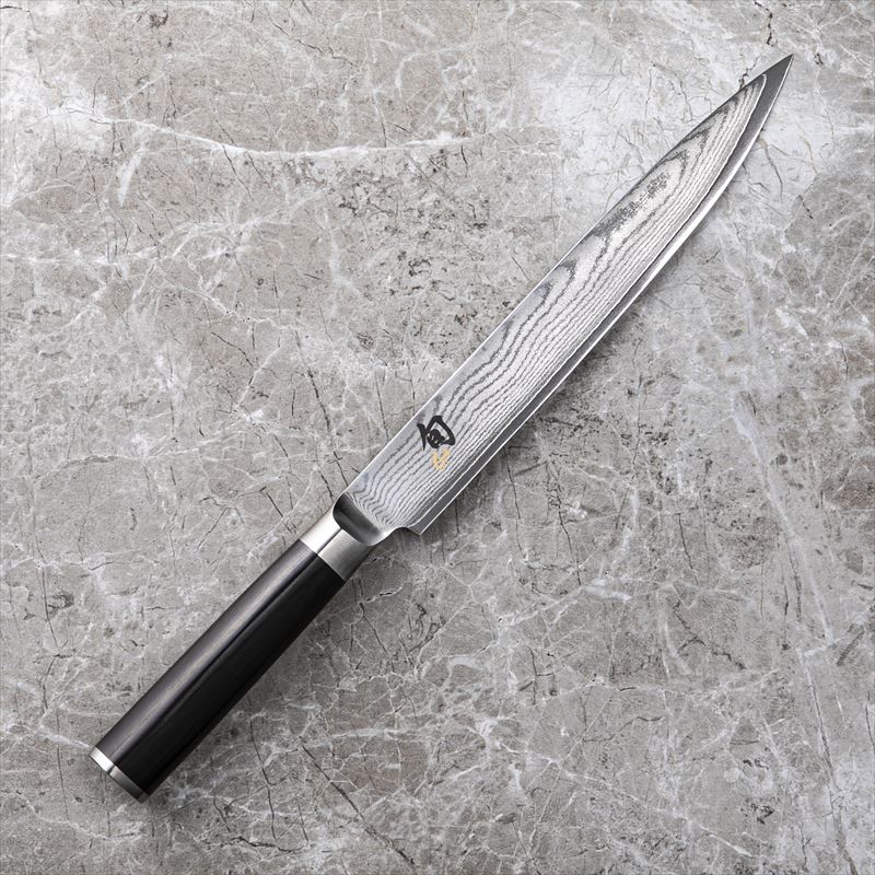 - 素材の繊維を崩さずに美しく切るための包丁です。刃渡りは225mmのタイプ。刃の長さを活かして、刃元から刃先にかけて一気に引き切りにします。