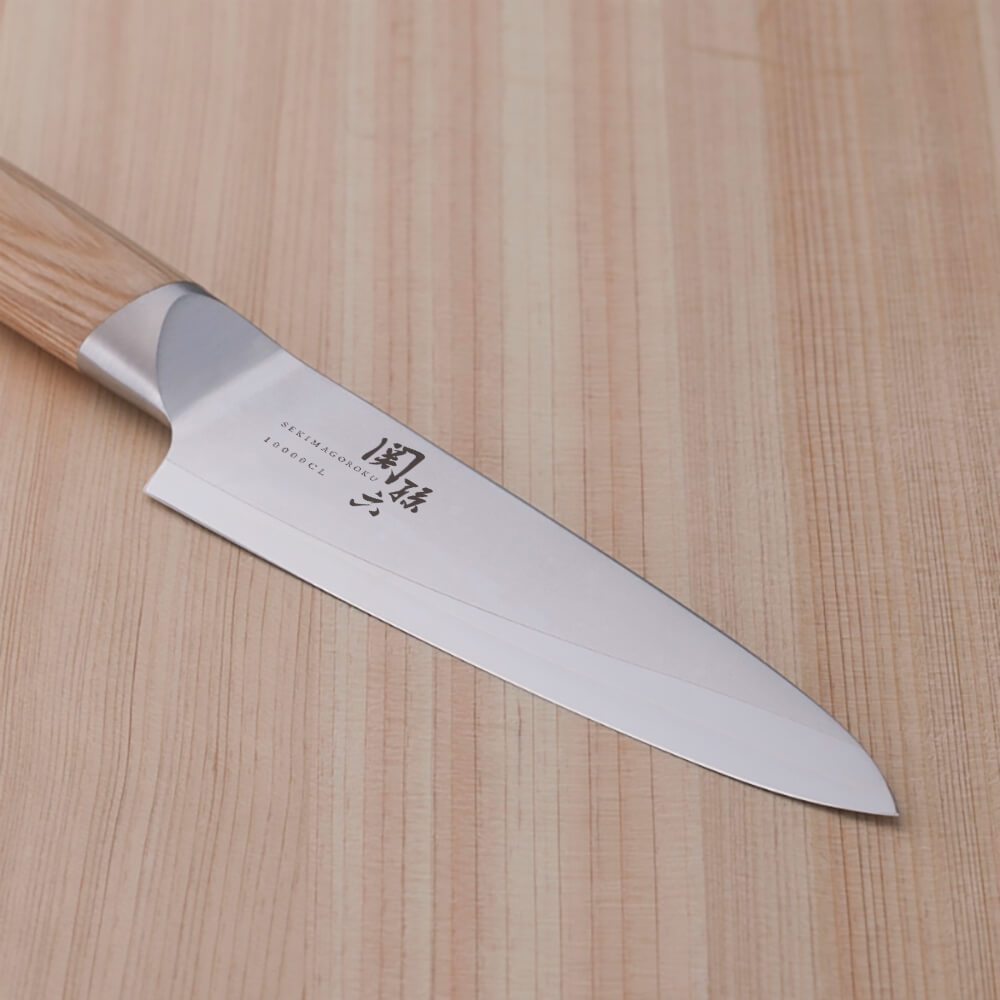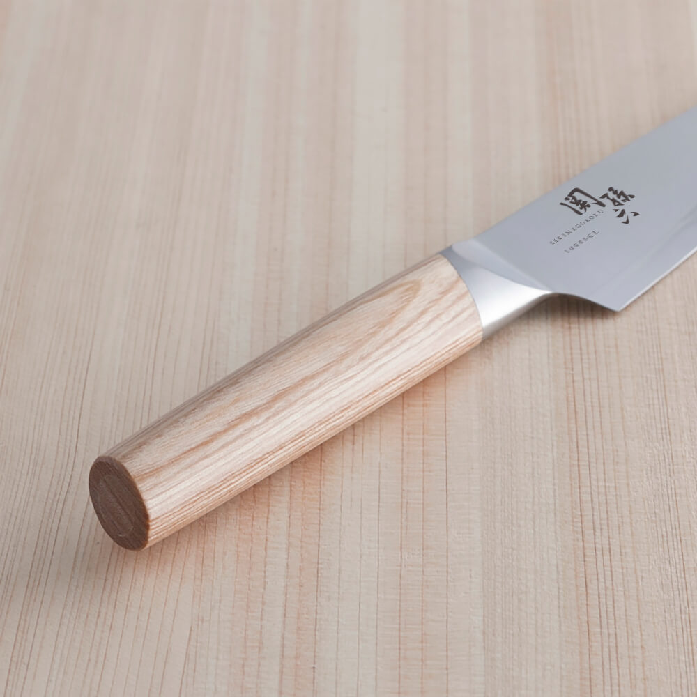 特殊精密接合(ろう付け)の技術を利用し、背側と刃側のコントラストで刃の波紋とハンドルは白合板を採用し流麗なデザイン性を表現しました。野菜切り・肉切り魚のさばきなど、様々な調理で活躍する日本が生んだ万能包丁です。