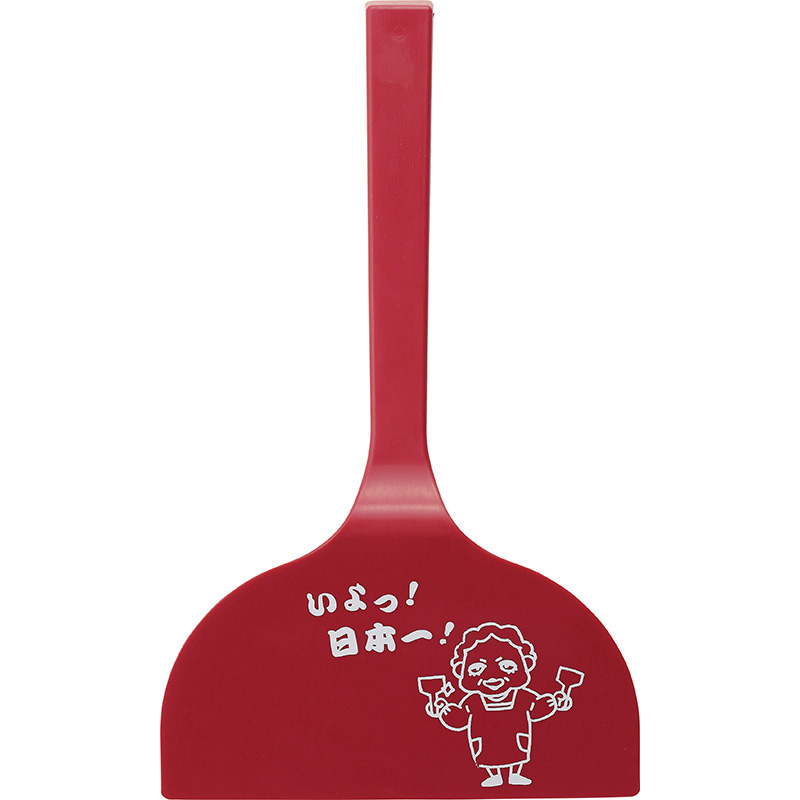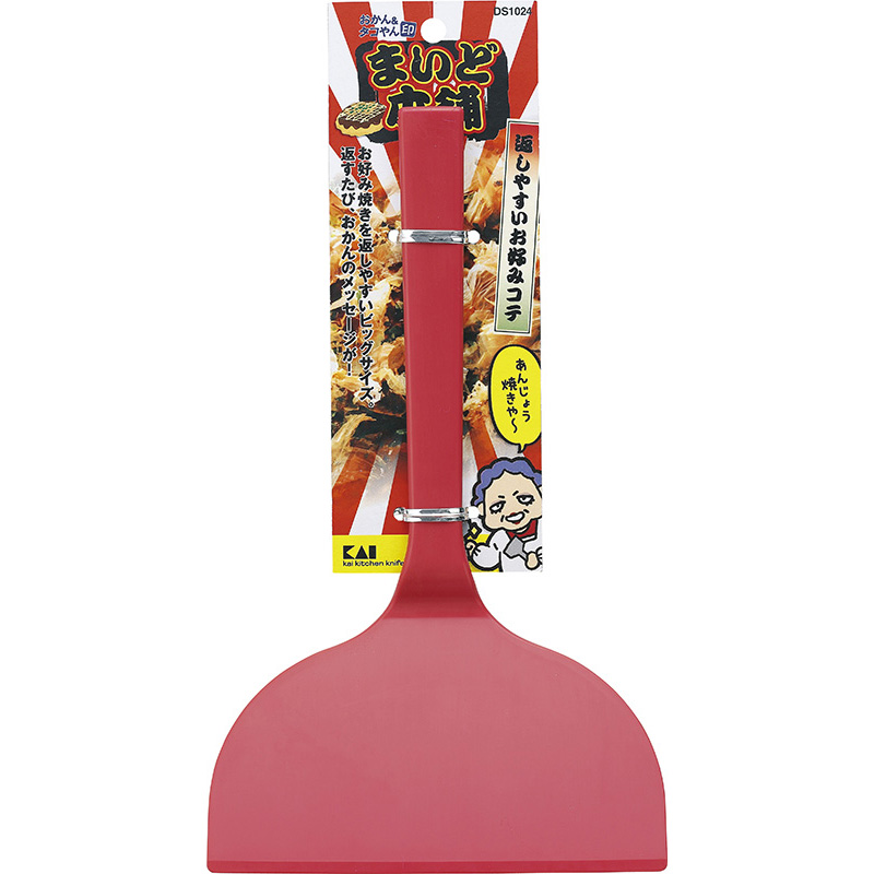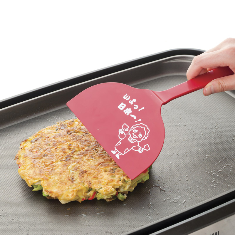 お好み焼きが返しやすいワイドタイプのへら。ひっくり返すと楽しめるキャラクターデザイン付。