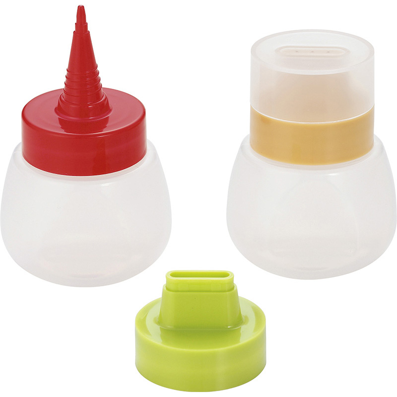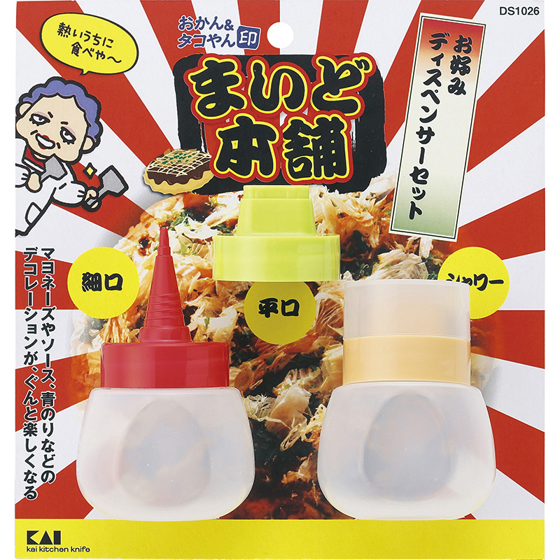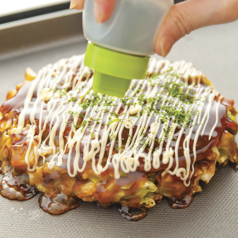 タコ焼きやお好み焼き用ディスペンサーのセット。ボトル2個とキャップ3種(細口、平口、シャワー)のセット。マヨネーズやソース・青のりなどのデコレーションが楽しめます。